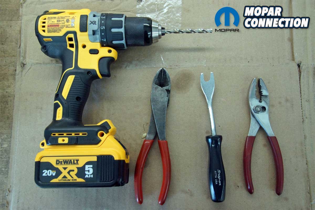 Top Left: We worked from the center rivets outward to the ends of the spoiler. Each fastener was rechecked for its tightness before we proceeded. Top Right: Each rivet pin was cut off with a pair of side cutters. All the pins were discarded. Bottom Left: The installation took about an hour. We applied a little spray wax to the spoiler to remove any fingerprints and protect the surface. Bottom Right: The tools necessary for the installation were a drill, ¼-inch drill bit, side cutters, a door panel removal tool, and a pair of pliers.