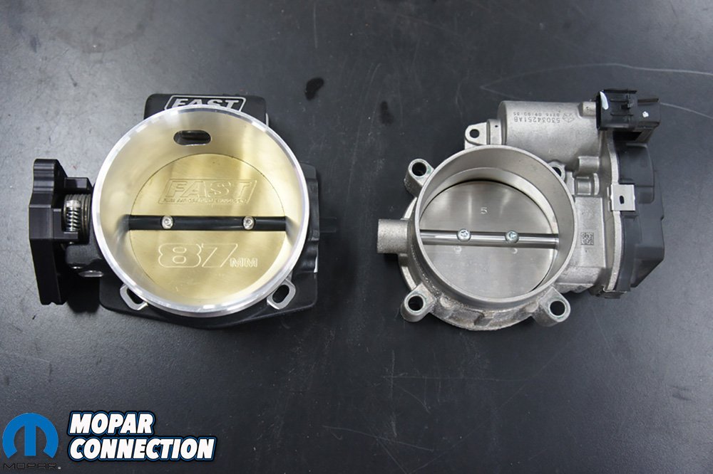 The FAST HEMI Big Mouth LT 87mm throttle body has been around a little while. It features an 87mm opening for increased air flow and horsepower over a stock Gen III HEMI throttle body.