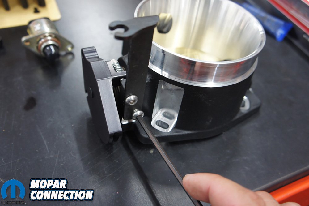 Once our HEMI swap was done and ready to fire up, we had to sync our Big Mouth LT TB up with our engine management system. We needed to adjust the throttle blade at idle a tad bit. It was very simple task using the adjustment screw on the side of the throttle body.