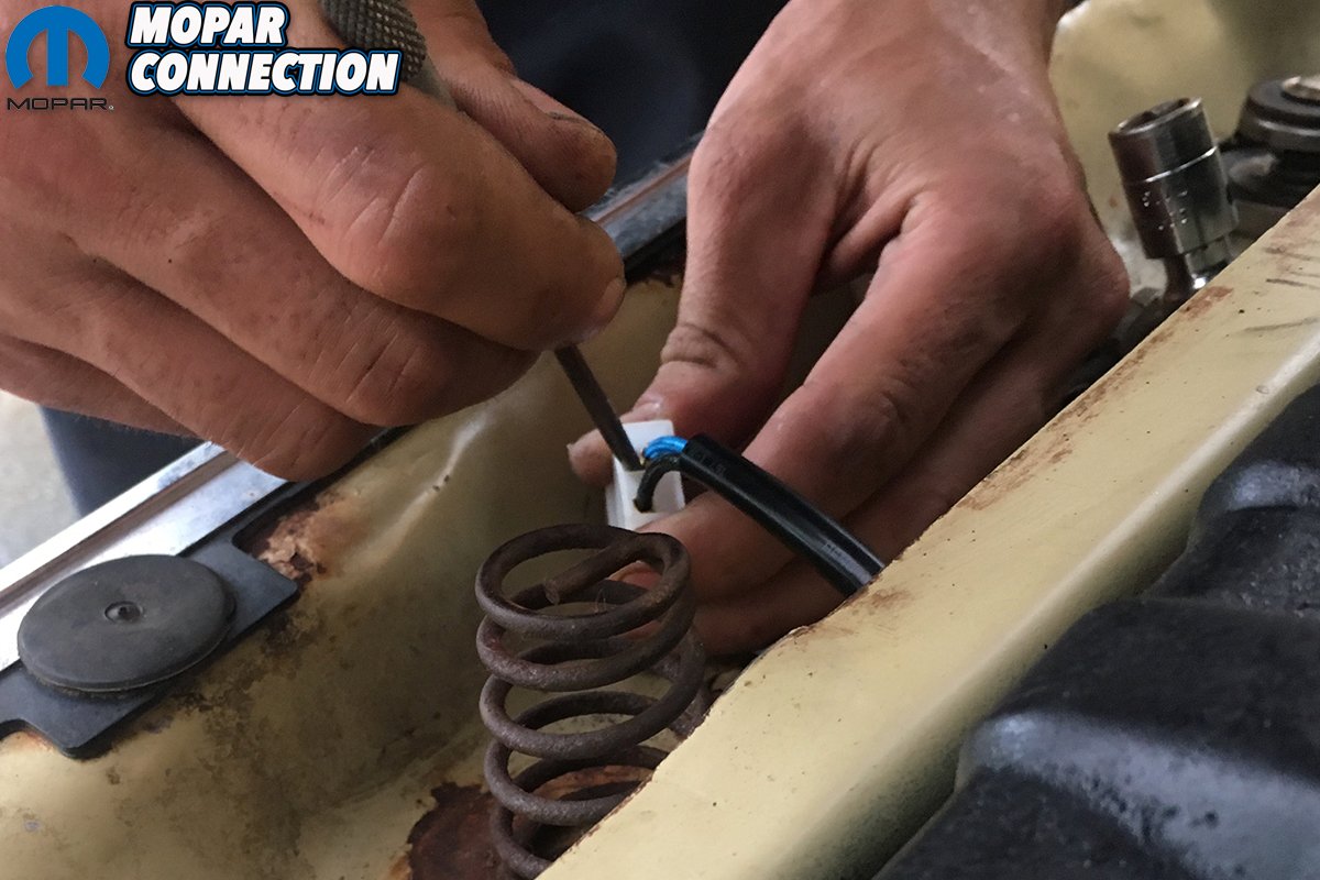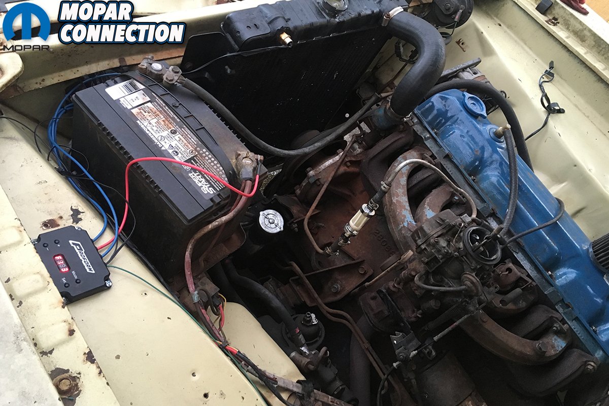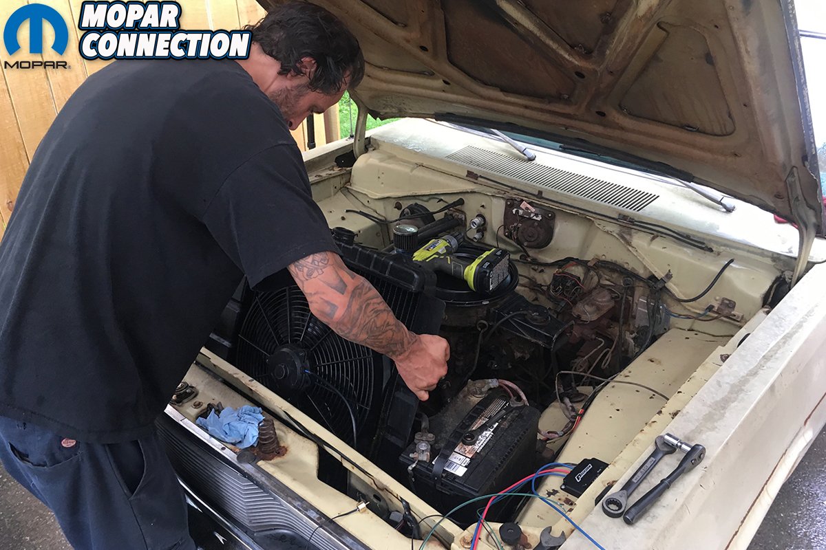 Meanwhile, we drilled and mounted our digital variable speed controller to the Valiant’s flat inner fender wells with some self-tapping screws. Proform provides a very simple, easy-to-follow installation guide. We ran power directly to the battery and to the fan, a negative wire to the body, the wire to the radiator temperature probe, and a final wire to the 12-volt ignition, so that the fan could operate when the key was switched to “Accessories.” The fan’s loom also required its own negative (ground), which was mounted to the core support.