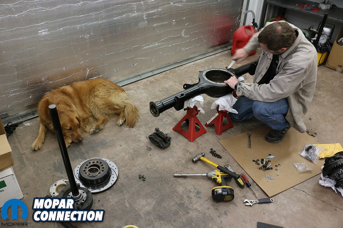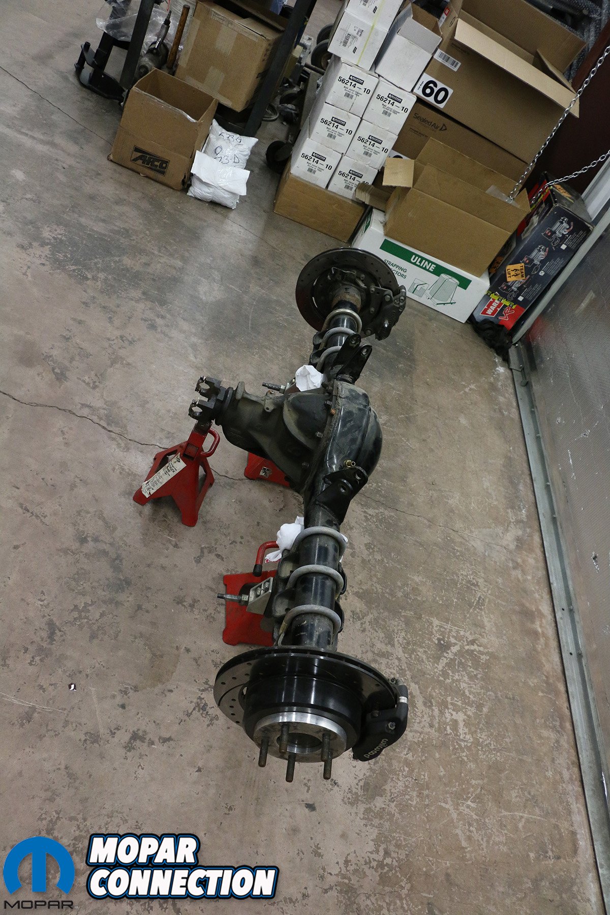 Above: While the crossbar was being cut out, we tore the old housing apart. We needed to reuse our brakes and center section in our new ready-to-install housing. The great part about the ready-to-install housing is you can fully assemble the rear end one time and your done. Now welding or fabrication required on the rear end and when it goes in its final assembly. We installed the center section, brakes and axles in the new Moser ready-to-housing. We bolted on the new Street-Lynx brackets to the perches and were ready to set it back in the car.