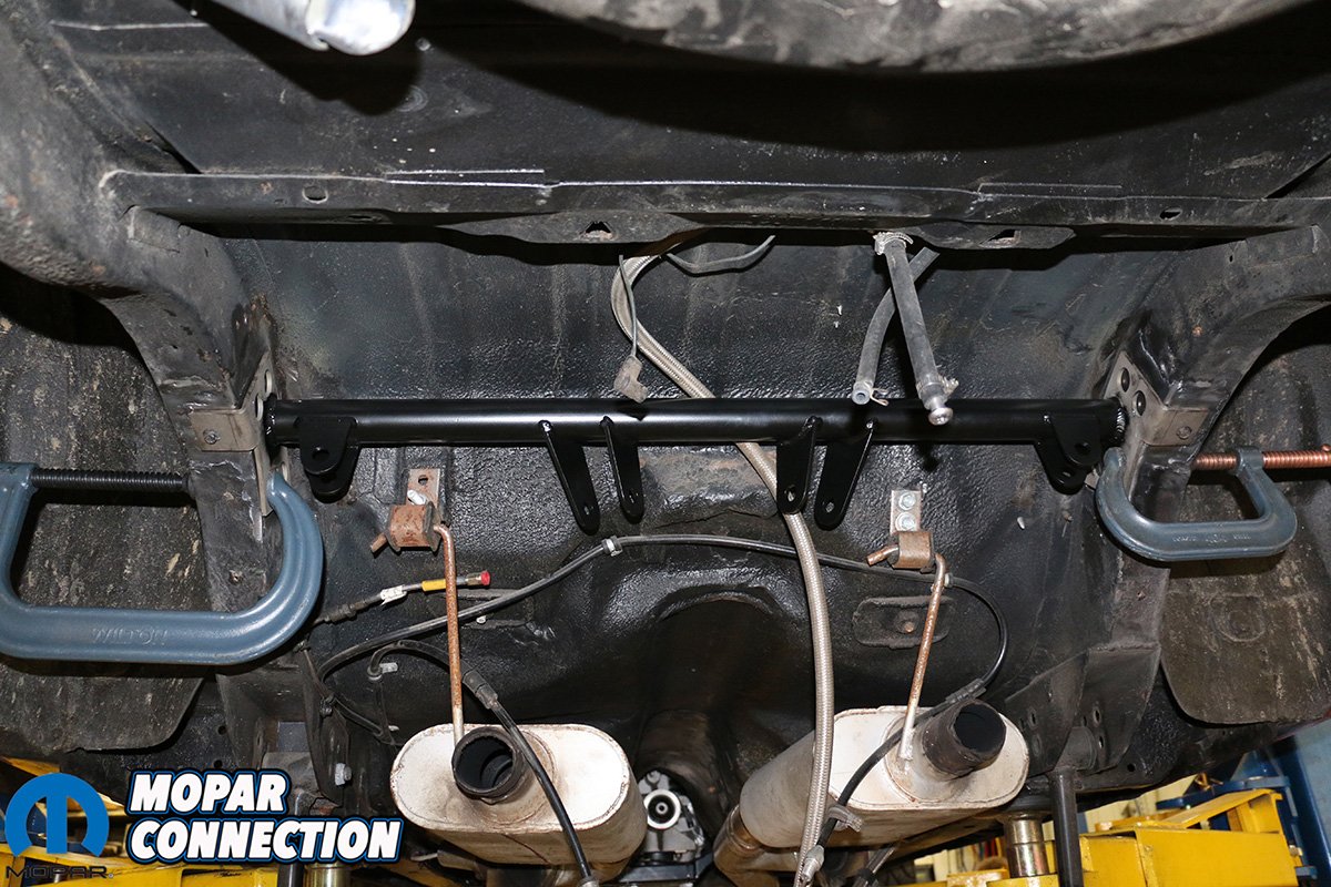 Above: If you opt for a sway bar you will need to follow the instructions RMS provides. Reinstall the fuel tank, brake lines, driveshaft and fuel lines. If you had leaf springs some of the lines might need to be altered to no interfere with the new suspension. We were lucky and since we had the Street-Lynx already in the car we had all of our lines routed properly. Once everything is installed cycle the suspension up and down to reassure nothing will interfere with the new suspension. Exhaust is a big one but you also don’t want fuel lines or brake lines getting pinched while driving the car. Its easiest if you remove the springs from the shocks and while the rear of the car is supported use a jack to raise and lower the rear end. When we first installed our Street-Lynx we didn’t do this and later on pinched a brake line.