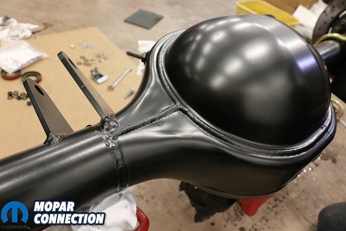 The new Moser 8 3/4 housings may look a little different from the stock housings. This is due to Moser’s round back design. If you’re installing a triangulated 4-link rear suspension we don’t think looks are too important but performance is. The new housings are stronger, have a drain plug and use better designed housing ends to accept Wilwood and Baer brake kits easier. After welding on the brackets and making the necessary modifications, RMS powder coats them satin black. The powder coating is done in house to ensure flawless coating and different colors if you are looking for a custom look.