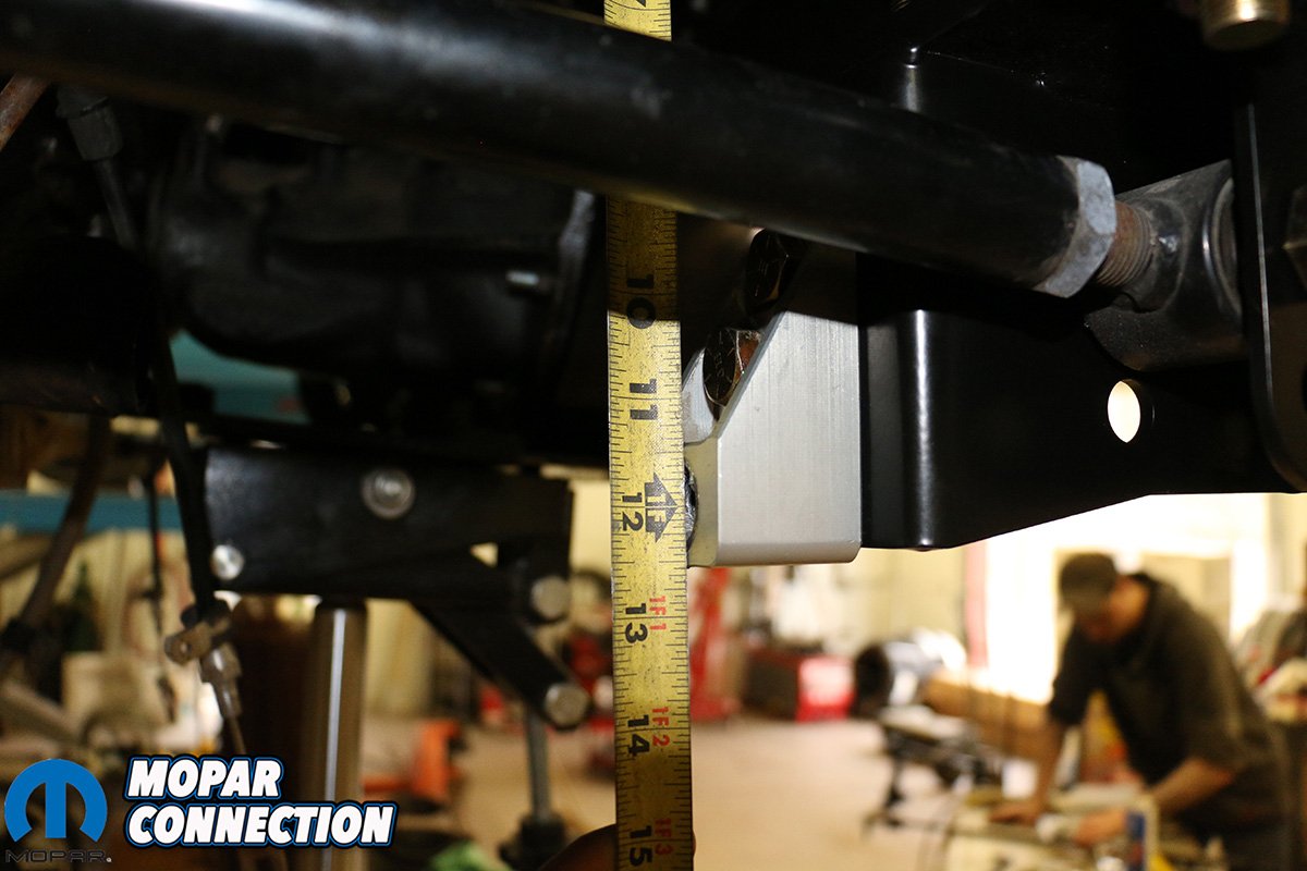 Above: With the 4-link bars installed we needed to check pinion angle. We raised the rear end to ride height, checking the distance of the shock mounts. Our pinion angle was sitting at 2.5 degrees negative (pinion pointing up) which for our application was fine because of our American Powertrain Magnum 6-speed transmission. Most applications should be between 0- and 1-degree negative.