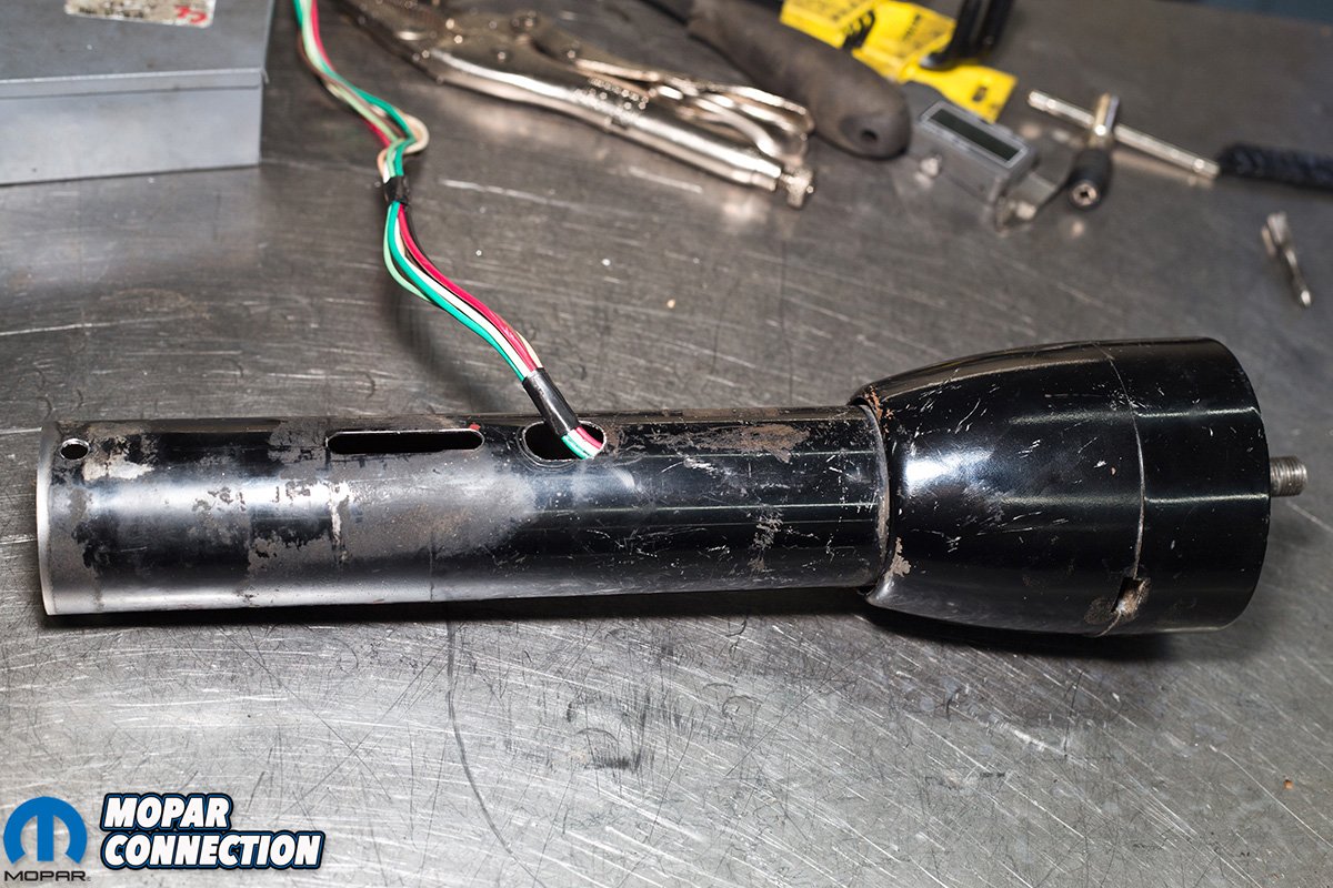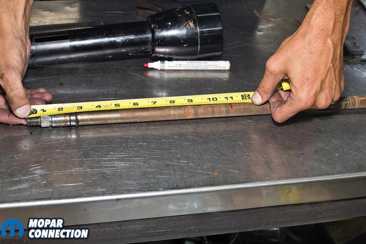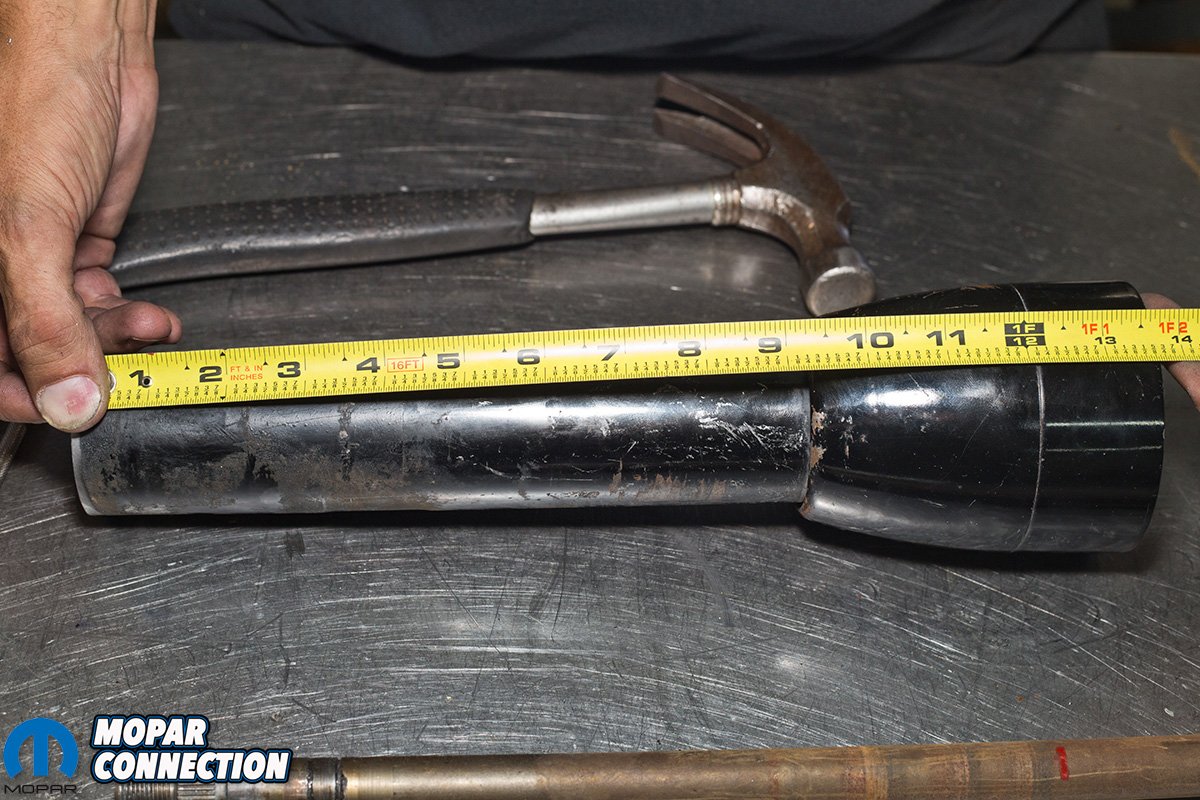Above Left: For the 1966 Barracuda, the steering shaft needed to be cut off at 11″ from the splined (top) side down. Above Right: The steering column housing will also need to be cut off square at 13 1/3″.