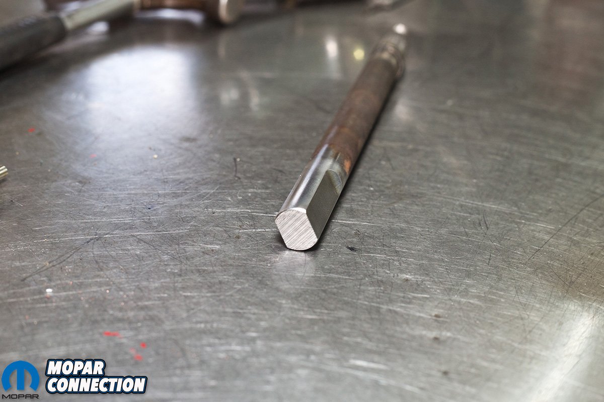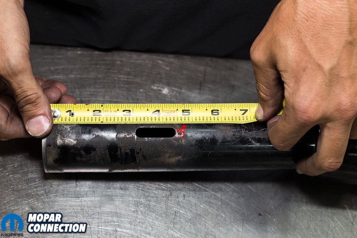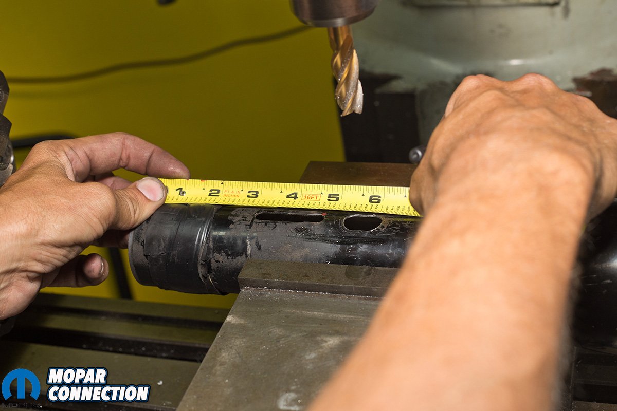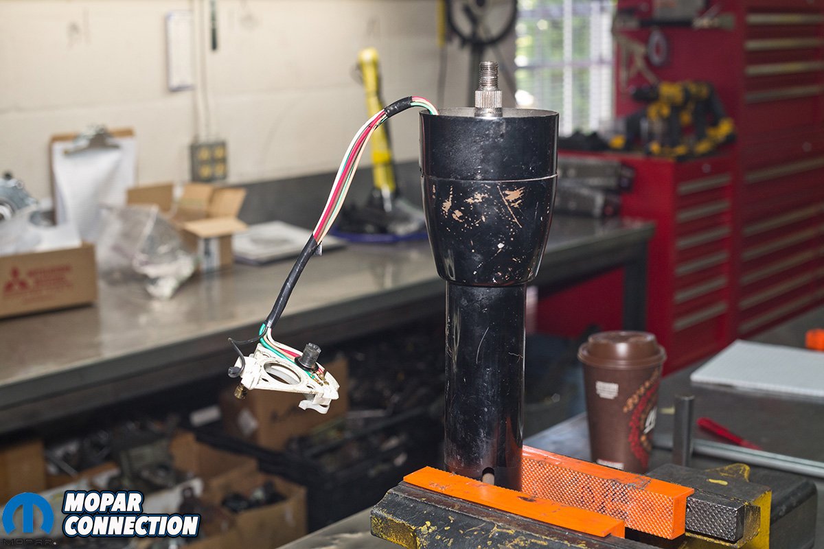 Above Left: For the 1966 Barracuda, the steering shaft needed to be cut off at 11″ from the splined (top) side down. Above Right: The steering column housing will also need to be cut off square at 13 1/3″.