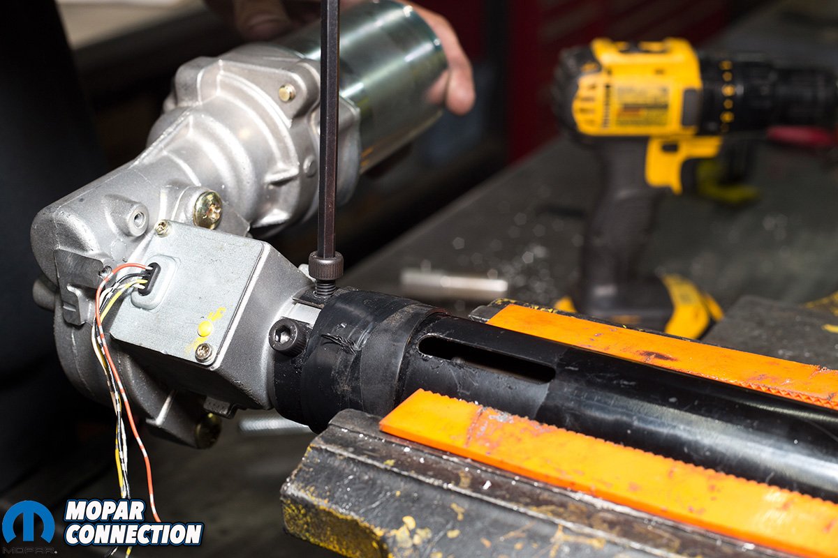 Top Left: The steering column wiring harness is routed through the new hole. Top Right: The end of the steering shaft is cut to a DD and ready for assembly into the electric motor. Bottom Left: You can see where the set screw needs inserted for the electric motor. Bottom Right: Inserting the set screw with some of the provided loctite.