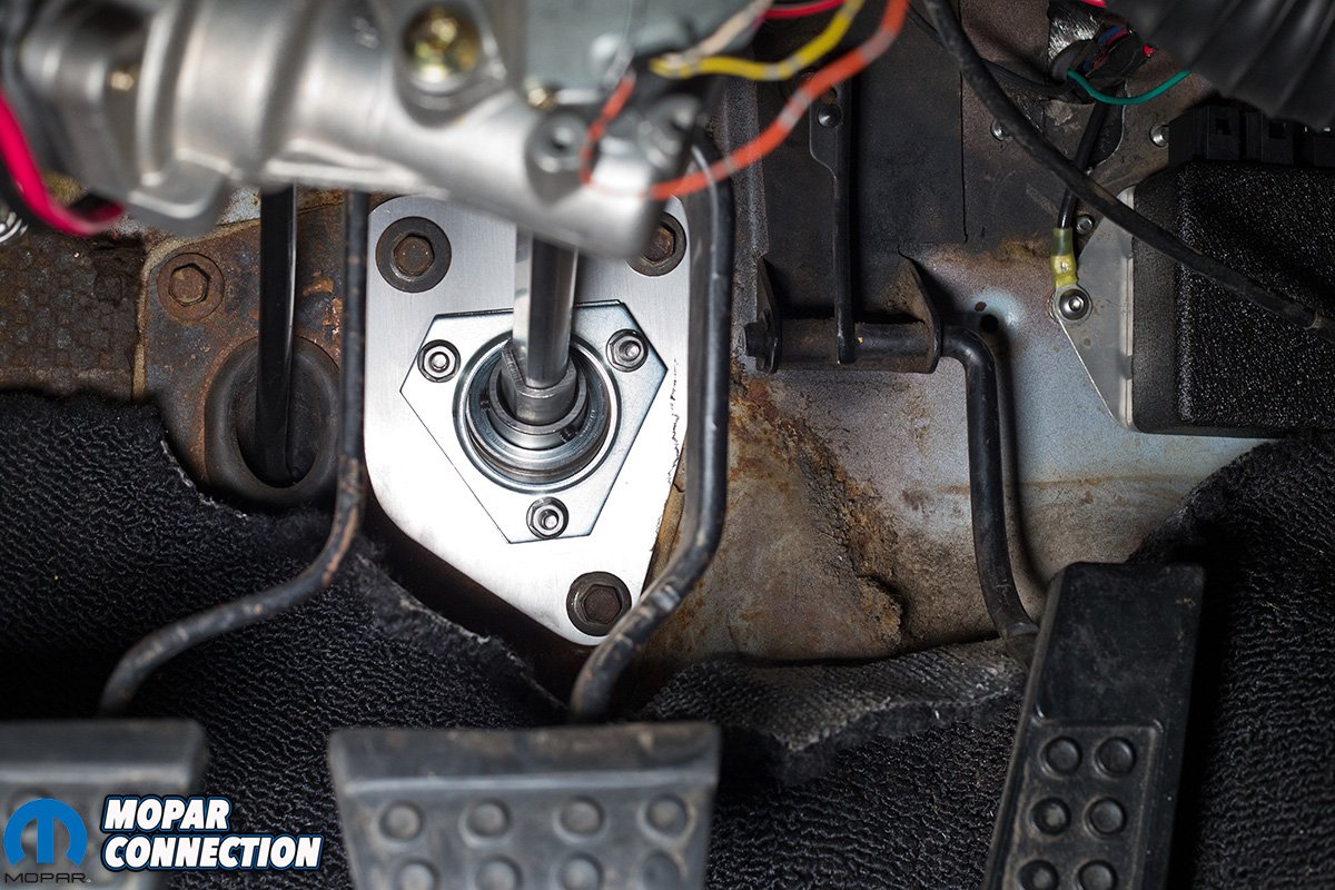 Above Left: Bolt the column back in, then before the rest of the steering shaft, install the new firewall plate and bearing. Above Right: With the column and linkage back in it was time to mount the control module which found a home above the gas pedal.