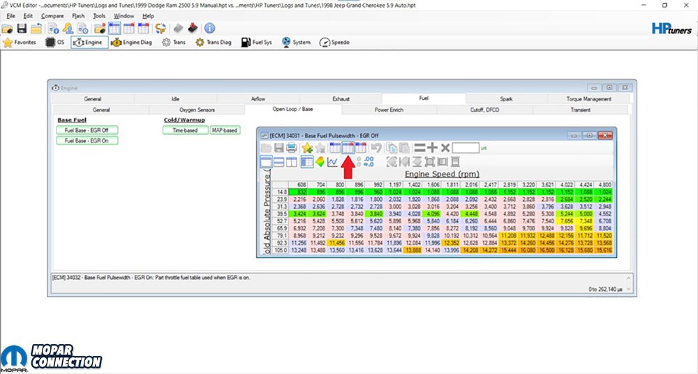 Unfortunately, JTEC tuning information is nearly nonexistent. Rather than start from scratch, we decided to take a small step forward by referencing a premium fuel tune that was factory-supplied in 1998 Jeep Grand Cherokee Limited models with the 5.9 Magnum. Using that file as a comparison would make it simple enough to see what parameters needed adjusted to make a jump in power when going from 87 to 93-octane pump gas. HPtuners’ comparison feature made it easy to open the two files at once and quickly spot the differences. Toggling between files was as simple as clicking the table button with a red asterisk (original file), blue asterisk (comparison file), or both asterisks for the delta between them.