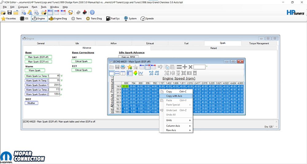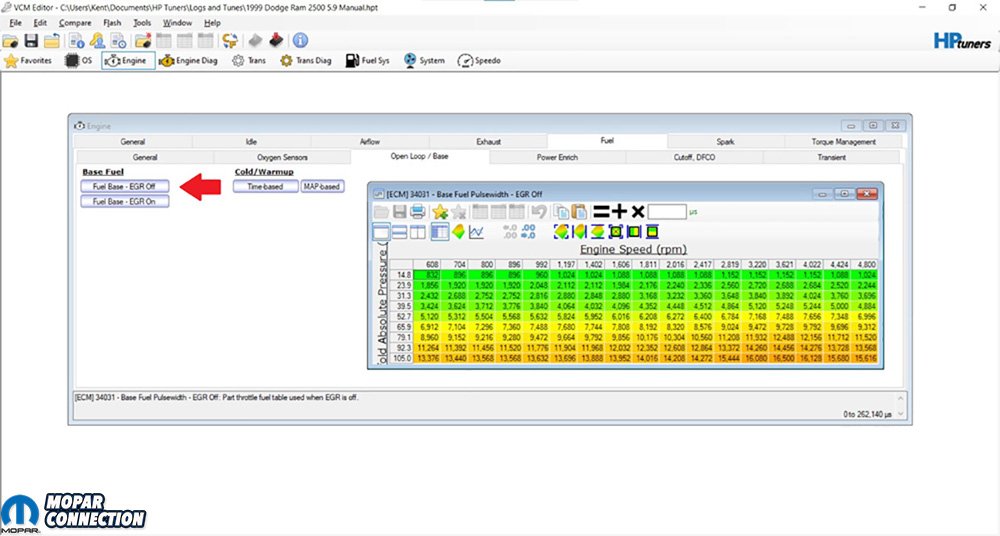 To keep it simple, the two most important parts of a tune file are generally going to be the fuel and ignition tables. For a JTEC PCM the base fuel table is titled “Fuel Base – EGR Off,” while the ignition index is called “Main Spark – EGR Off.” Power enrichment is also important as those tables act like a power valve (PV) would in a carburetor. Just like a PV adds fuel based on vacuum or manifold absolute pressure (MAP), power enrichment tables add fuel based on MAP and RPM.