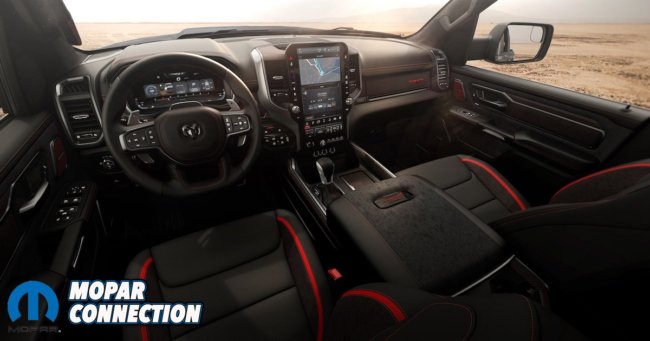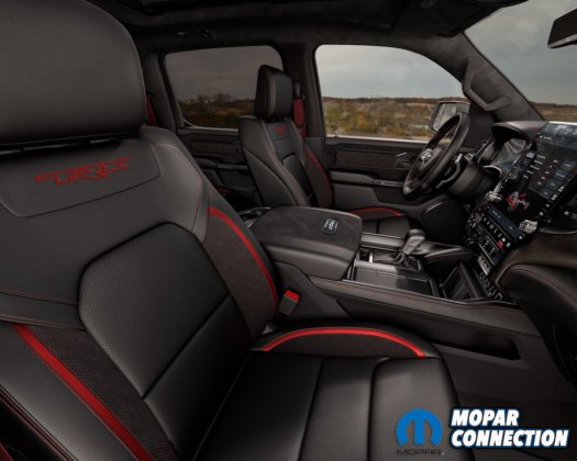 This includes leather-and-suede-wrapped heated and cooled front seats with 12-way power adjustment, heated rear outboard seating positions, a 14.5-inch Uconnect 5 reconfigurable touchscreen, a 12.3-inch reconfigurable digital gauge cluster, the slick 360-degree camera system, a full-color 10-inch Head Up Display, a 900-watt Harman Kardon audio system and a healthy dose of leather and carbon fiber trim throughout the cabin. The new TRX joins the RHO as being the only performance trucks on sale today with Hands-free Active Driving Assist with Level 2+ automated driving capabilities.