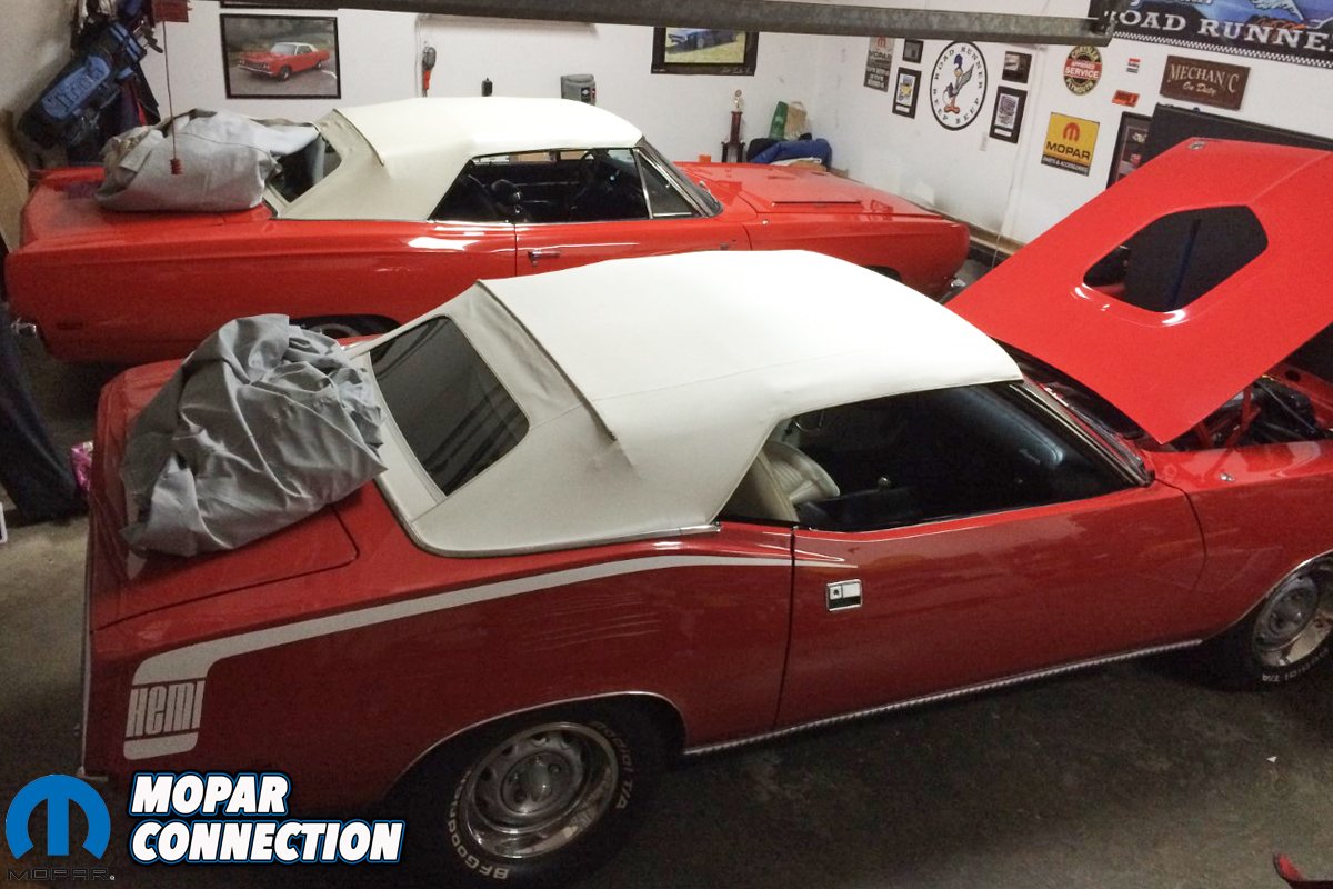 Above left: After 45 years I finally had the two cars I loved the most out of all the Mopars that were ever produced: a ’69 Road Runner convertible, R4 red with white top, numbers matching, and now a ’70 Hemi ‘Cuda convertible. Something that I never dreamed I would ever own since that fateful day I first saw the car on the cover of the September 1969 issue of Motor Trend. Above right: After getting the seller down on the eBay purchase price and hauling it to Nashville from Tampa, the car of my dreams was finally in my garage.