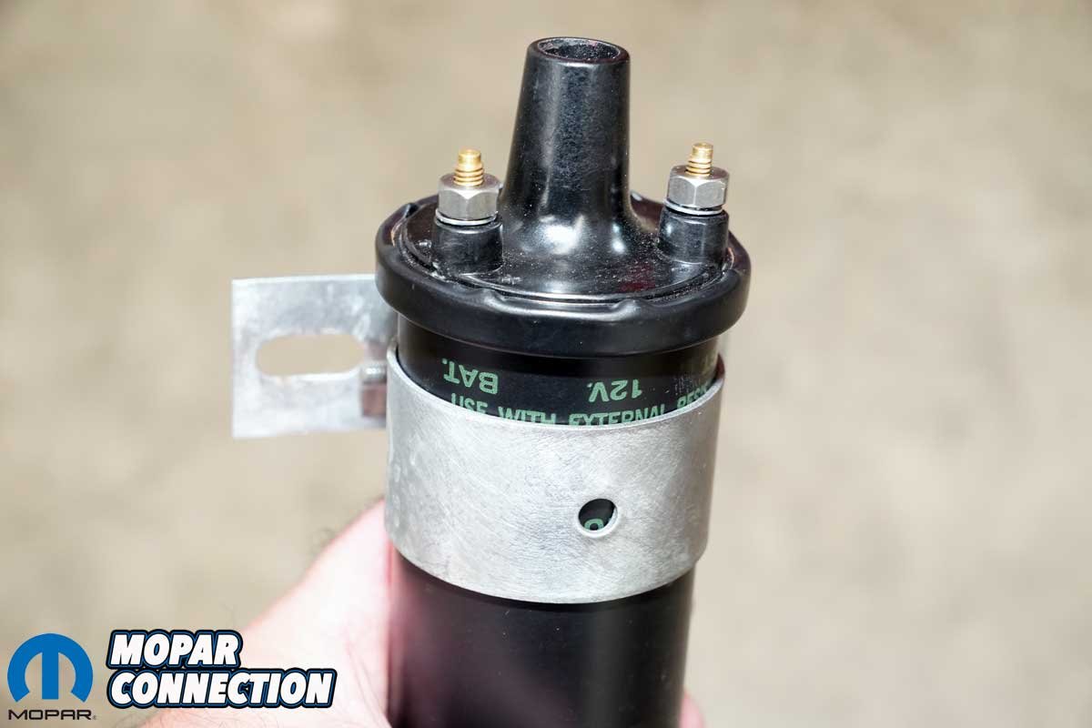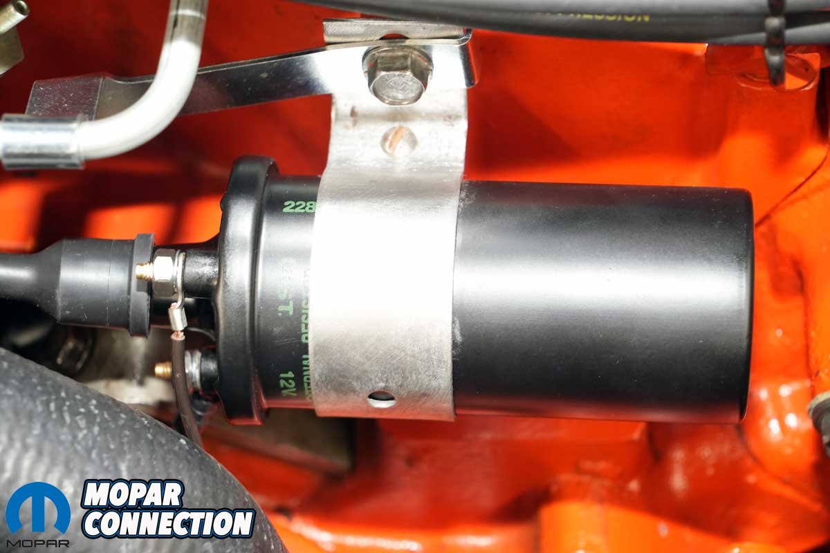 Above Left: To restore the Road Runner’s ignition system to its original factory look and function, we sourced a correctly labeled ignition coil from YearOne. The coil features authentic green lettering that matches the original equipment style used in 1968. Above Center: The coil we chose was date-coded “228,” indicating it was manufactured during the 22nd week of 1968, an ideal match for our car’s production timeline. YearOne offers a wide selection of date-coded coils to suit various years and applications, making it easy to find the right fit for your restoration. Above Right: The factory-style coil bracket secured the new coil perfectly, confirming both the visual and functional accuracy of the installation.