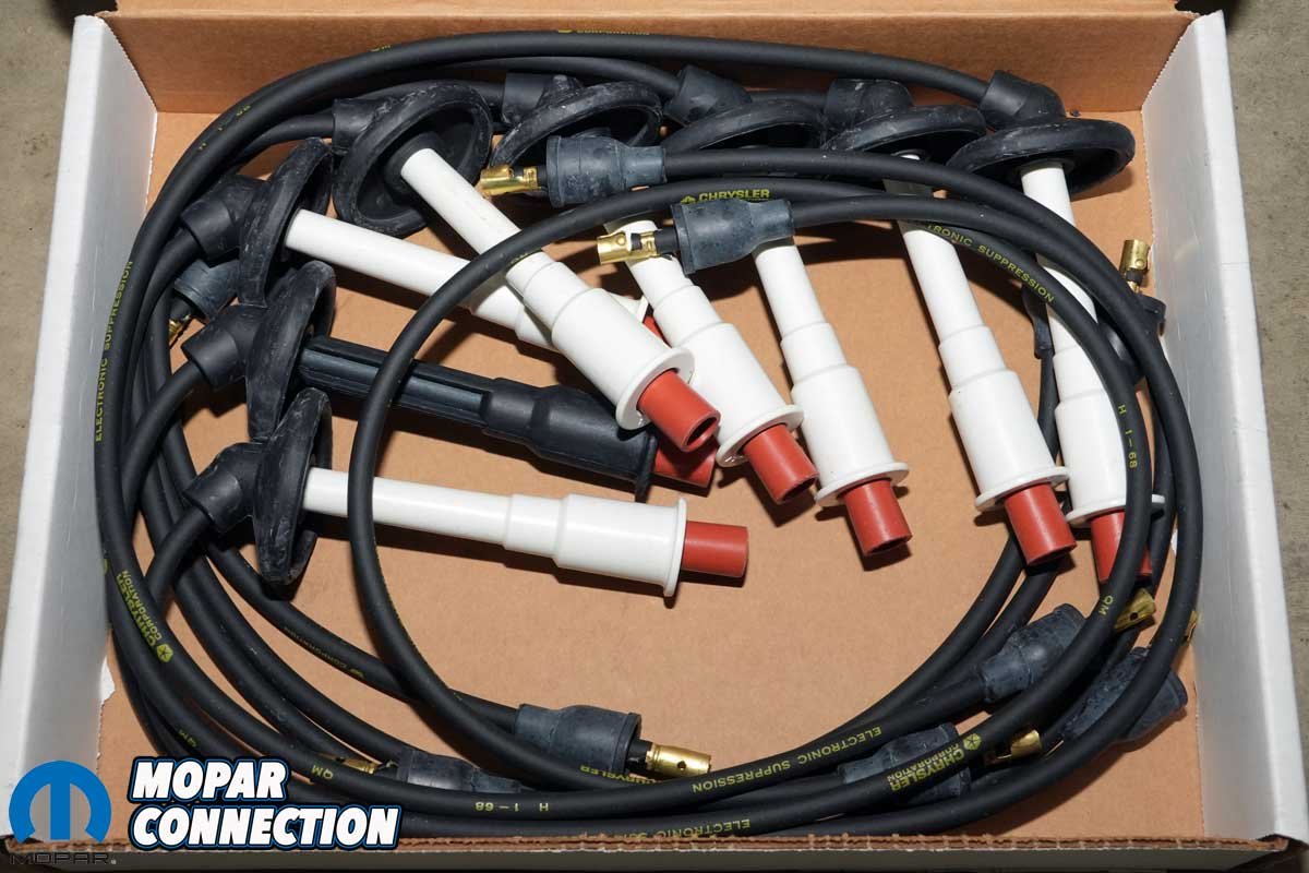 These wires are accurate reproductions of the originals, featuring black cables with correct yellow lettering, a Chrysler Pentastar logo, and first-quarter 1968 date codes. Each wire features proper black boots, including one special rubber connector on cylinder #7 to replicate the factory setup. The first-quarter build date covered the cars produced from March 1968 to August 1968.