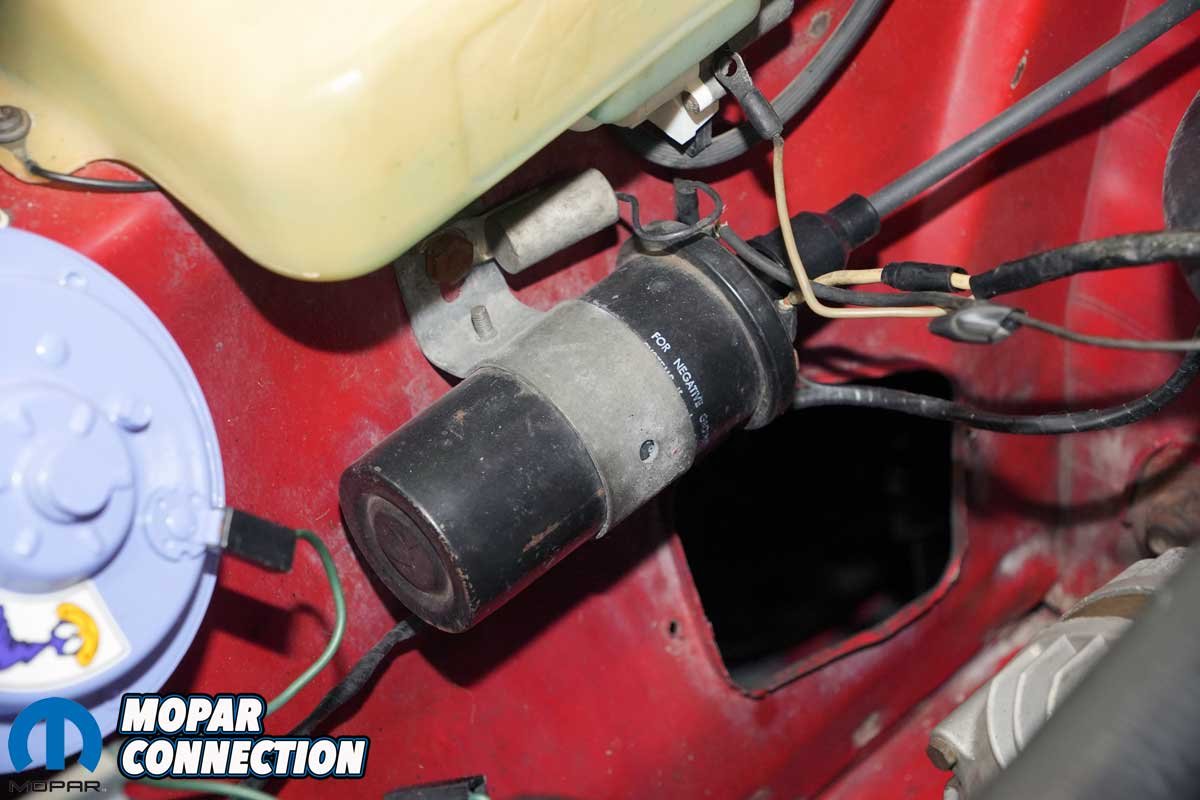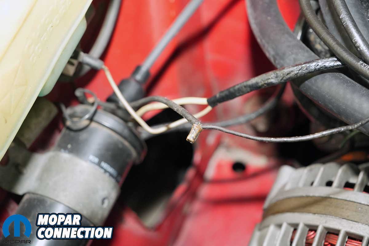 There were numerous concerns with the ignition that we almost did not know where to begin. The coil had been relocated from its original position on the intake manifold to the inner passenger-side fender, mounted under the windshield washer reservoir. The coil-to-distributor wire was cobbled together from three different sections of wire, one of which was soldered and the other joined with a slip-on connector.