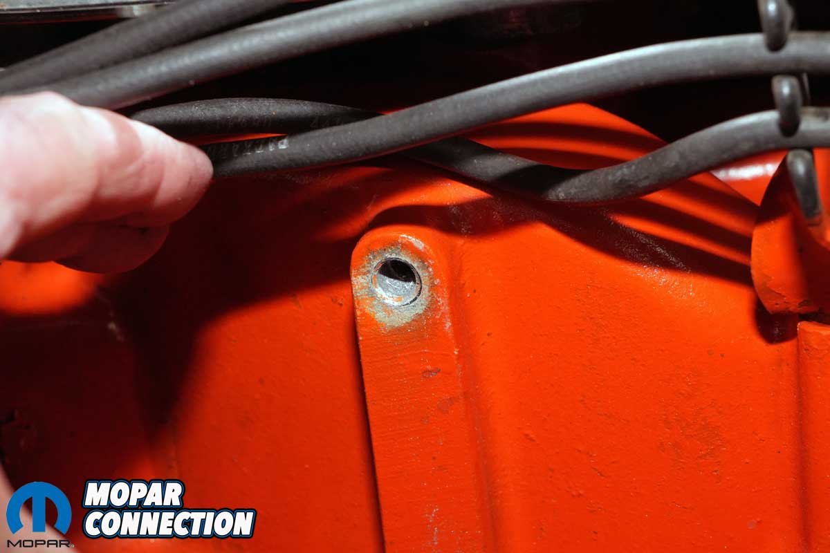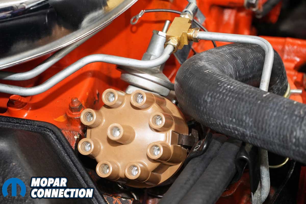 We fired up the Hemi, set the timing, and verified the total advance with the engine revved to 2500 rpm. Everything was spot-on. With the timing locked in, we removed the plug from the rear AFB vacuum port and ran a hose to the distributor’s vacuum canister. With the engine running, we opened the throttle and confirmed the vacuum advance was contributing an additional 16°, for a total of 50° BTDC under cruise conditions.