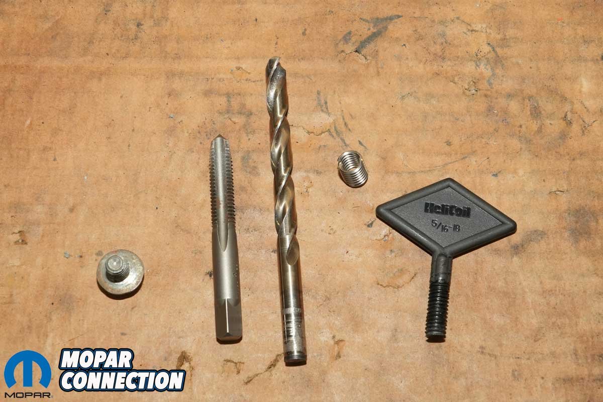 Above Left: To repair the stripped threads in the intake manifold, we used a 5/16-18 Heli-Coil kit. The kit came complete with the appropriately sized drill bit, tap, and installation tool, everything needed to restore the original thread size and strength. Above Right: We carefully drilled out the damaged holes to the larger size required for the Heli-Coil inserts, making sure not to go too deep and risk compromising the manifold. Precision was key to ensure a clean, secure repair.