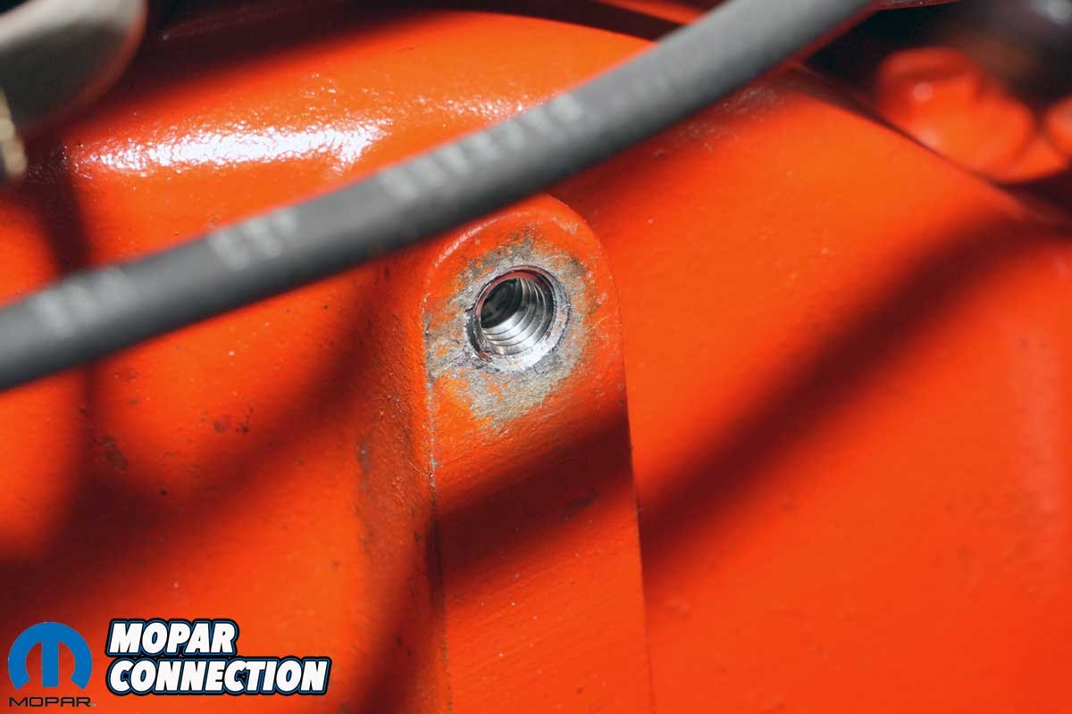 Above Left: The original coil bracket bolts were still in place on the intake manifold, though the upper bolt is partially obscured by a plug wire in the photo. Above Right: When we removed the bolts, it became clear why the coil may have been relocated. The aluminum threads in the intake manifold were completely stripped. It is likely this problem prompted a previous owner to move the coil rather than repair the mounting point.