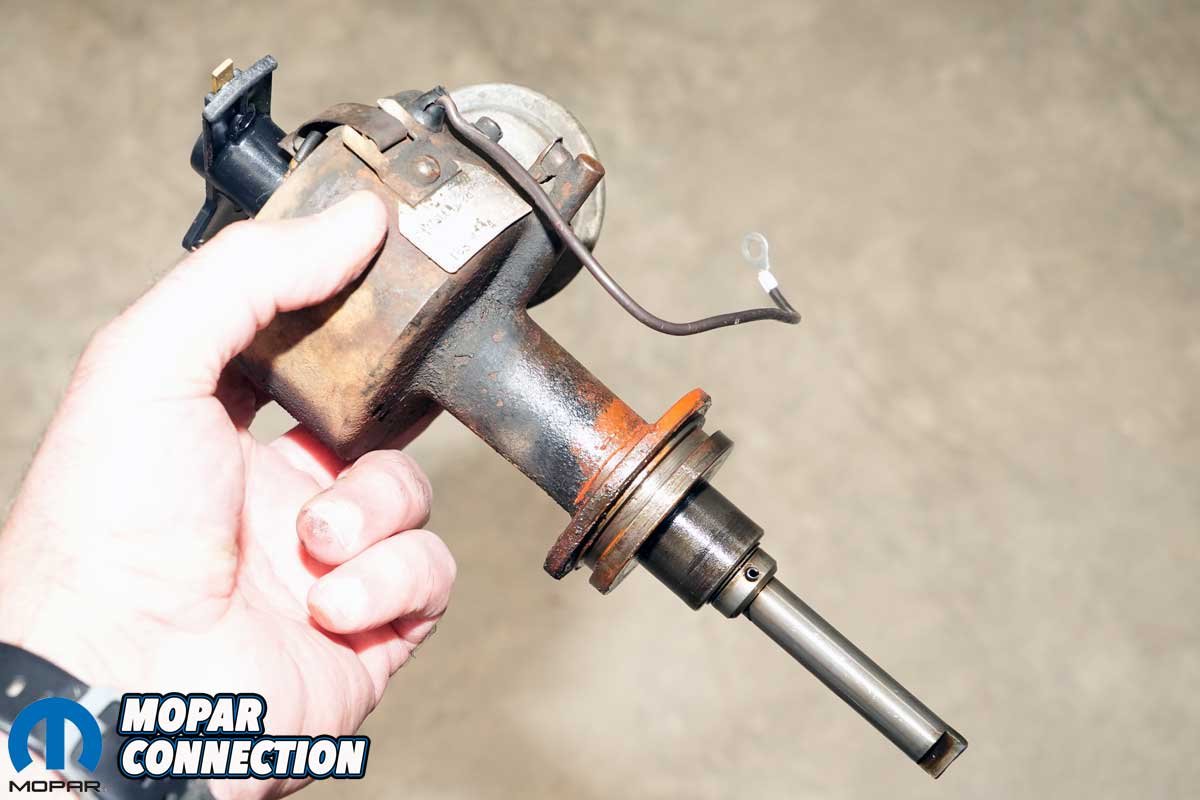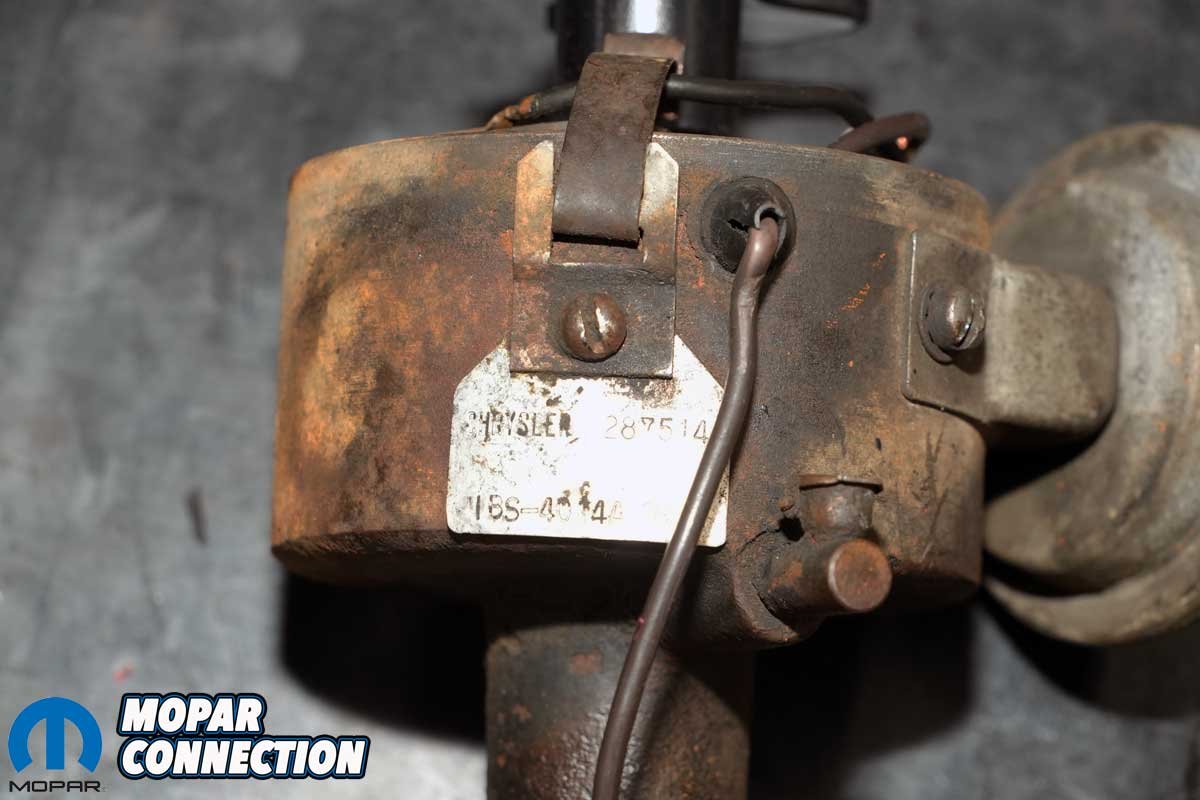 Above Left: The dual-point distributor raised several concerns during our inspection. We tested the base timing, centrifugal advance, and vacuum advance functions. The base timing was out of spec, the centrifugal advance provided far less movement than factory specifications called for, and the vacuum advance unit failed to hold any vacuum, rendering it inoperative. Above Center: Removing the distributor followed the typical Mopar procedure for the era. We first rotated the engine until the harmonic balancer mark aligned with top dead center (TDC) of cylinder one, then noted the position of the rotor to ensure proper reinstallation. With that done, the distributor came out smoothly. Above Right: Despite the internal issues, the distributor carried the correct factory part number for a 1968 Hemi, an encouraging sign for a numbers-matching restoration.