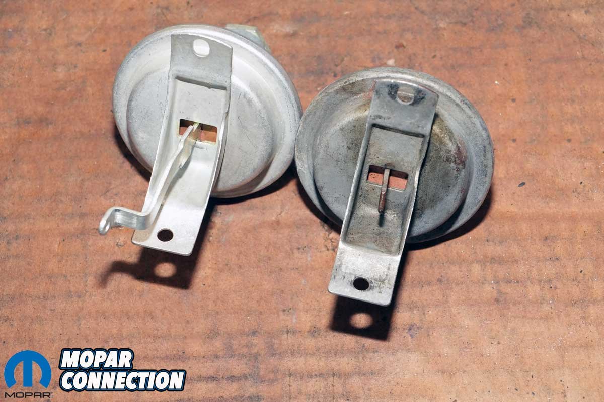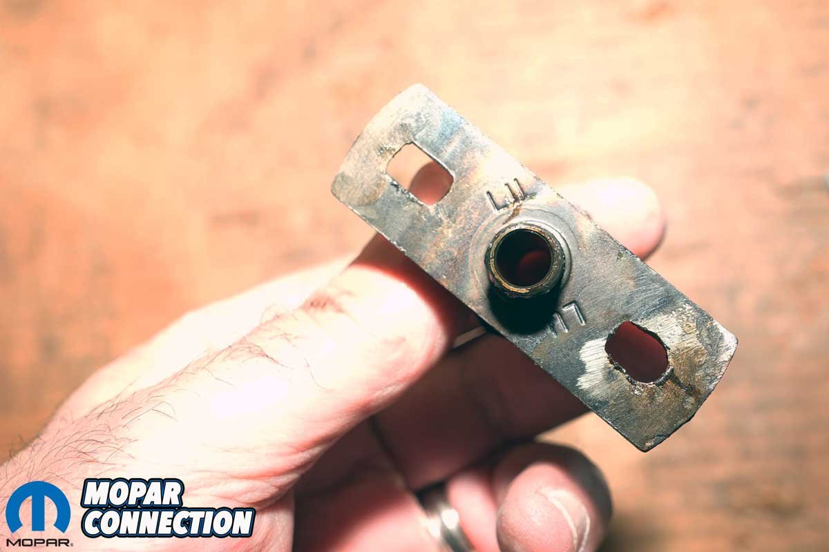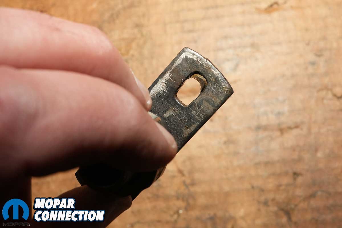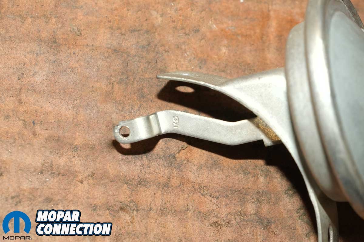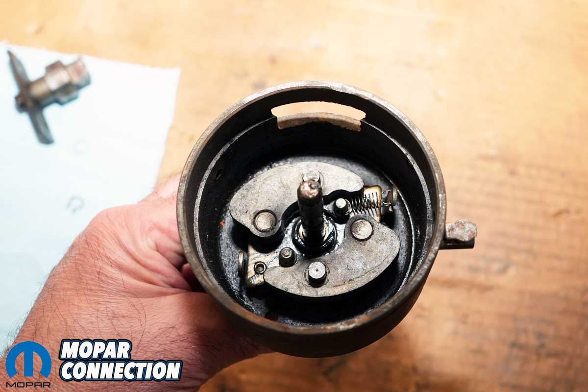 Above Left: Unlike many other Mopar vacuum units that are adjustable with an Allen wrench through the vacuum port, this Hemi-specific unit uses shims to fine-tune the advance curve. Above Center: The vacuum advance arm is uniquely shaped for the Hemi application, different from the arms found on most other Mopar distributors. Ours had a “9” stamped into the linkage, indicating a total vacuum advance of up to 18°. Above Right: Physically, the new vacuum advance unit (left) is identical to the original, but unlike the old one, it functions as it should, holding vacuum and delivering proper timing adjustment.