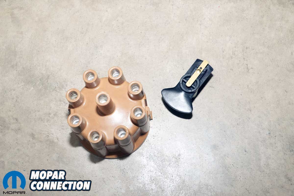 Above Left: We sourced a correct tan distributor cap and a new rotor from Megaparts.com, both period-correct pieces to match our restoration. Above Center: With the distributor fully rebuilt, we reinstalled it into the distributor testing machine. There, we verified the centrifugal advance curve, measured total advance, checked the rate of advance, and tested vacuum advance function. All test data was carefully recorded for reference. Above Right: The restored distributor was then installed into the Hemi. We aligned the rotor with the appropriate cylinder terminal on the cap and snugged the hold-down bolt, leaving room for final timing adjustments.