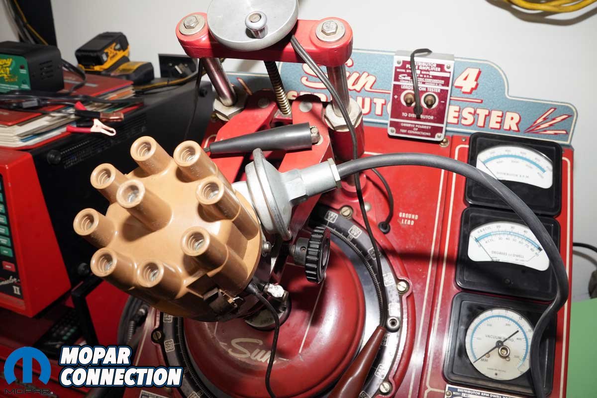 Above: We picked up a Sun 404 distributor machine about 15 years ago, thinking it might come in handy for setting up distributors on our old Mopars. It turned out to be one of the most valuable tools in the garage. Interestingly, this was the first time we used it to test a points-style distributor. As expected, the results confirmed our suspicions: the centrifugal advance curve was too short, and the vacuum advance unit was not functioning at all. On top of that, the ignition dwell was well below the factory specification of 37 to 42°, another concern that needed correction.