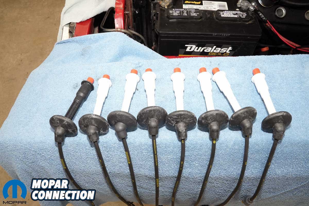Above Left: We laid out the spark plug wires from longest to shortest to ensure proper selection for cylinder assignment. Organizing them this way helped prevent incorrect routing. Above Right: All the plug wires matched the correct design for our application, including the unique wire for cylinder #7, which features a flexible extension to reach the recessed spark plug while not requiring an overly long plug wire.