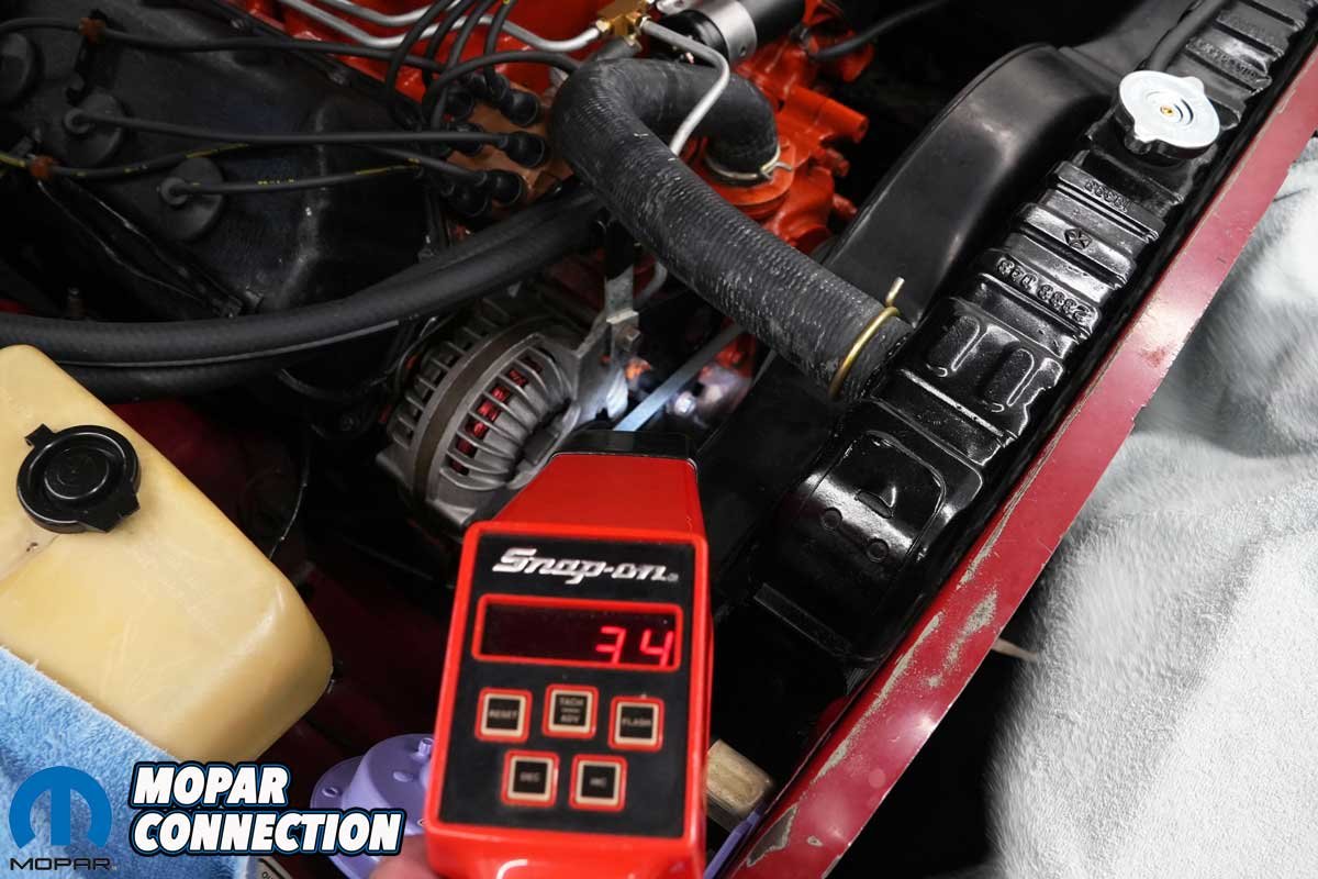 Above Left: With the Hemi warmed up to operating temperature and the transmission in drive, we set the initial ignition timing at 16° before top dead center (BTDC), ensuring a stable idle and crisp throttle response. Above Center: Shifting the transmission into neutral, we brought the RPM up to observe total mechanical advance. The timing mark settled at 34°, combining the 16° of initial timing with 18° of centrifugal advance. Above Right: After reconnecting the vacuum advance, we saw an additional 16° added to the total timing, bringing the grand total to 50° under light throttle conditions, ideal for part-throttle cruising and improved fuel efficiency.
