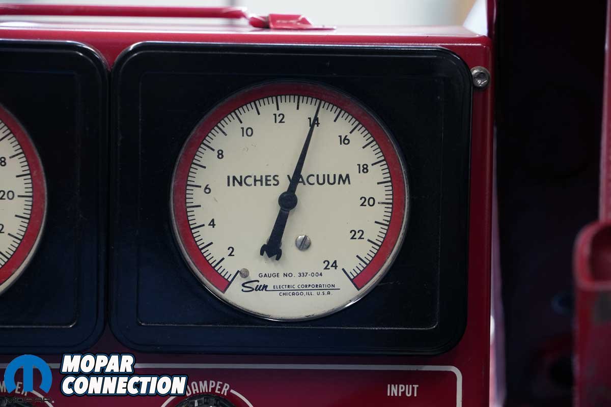 Above Left: We brought out the trusty Sun Counselor II scope to evaluate the ignition system. This classic diagnostic tool allowed us to visually inspect spark patterns, cylinder balance, and coil performance in real time. Above Right: With the transmission in gear and the Hemi idling smoothly, the vacuum gauge showed a steady 14 inches of mercury (inHg), indicating healthy engine vacuum and proper tuning at idle.