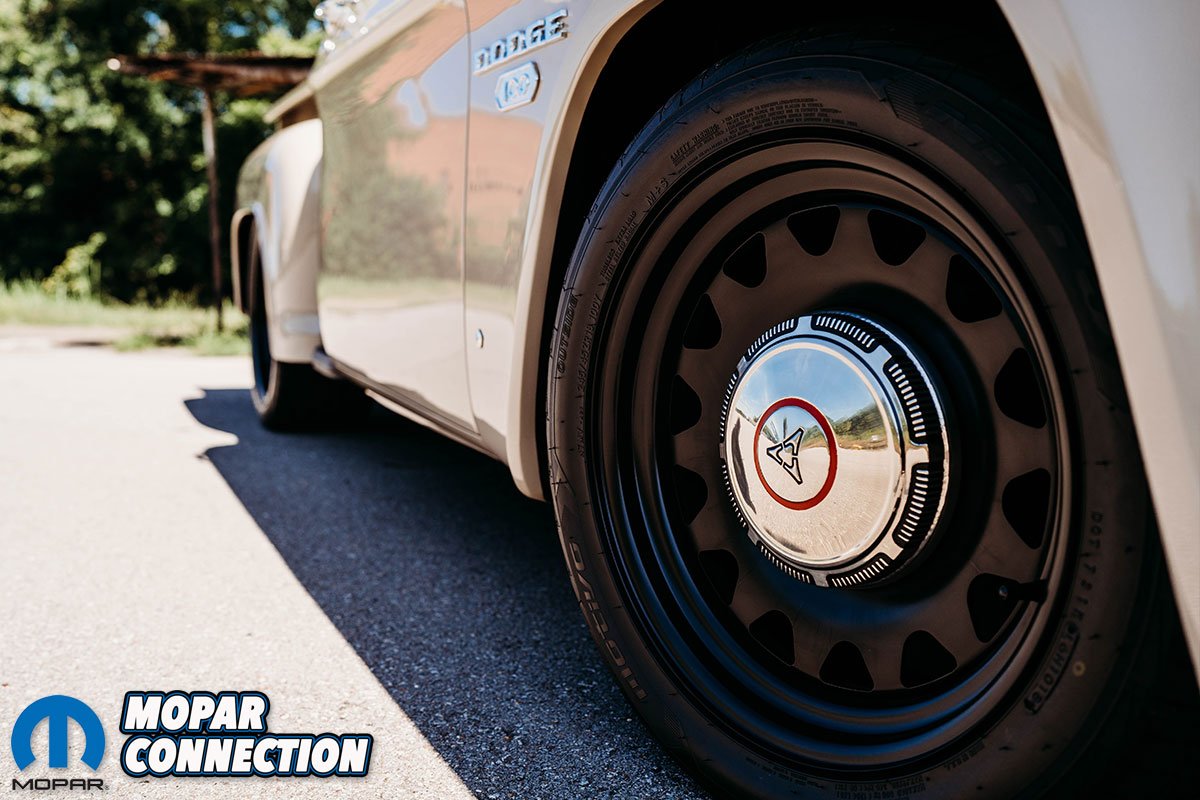 Out back, the bed features a beautifully stained wood bed with chrome trim accents. The D-100 rides on staggered (18×8 up front and 20×11 out back) matte black wheels from Detroit Steel matched with factory chrome redline dog dish hubcaps. The wheels are wrapped in Nitto Motivo tires sized at 245/45ZR18 up front and 315/35ZR2 out back respectively.