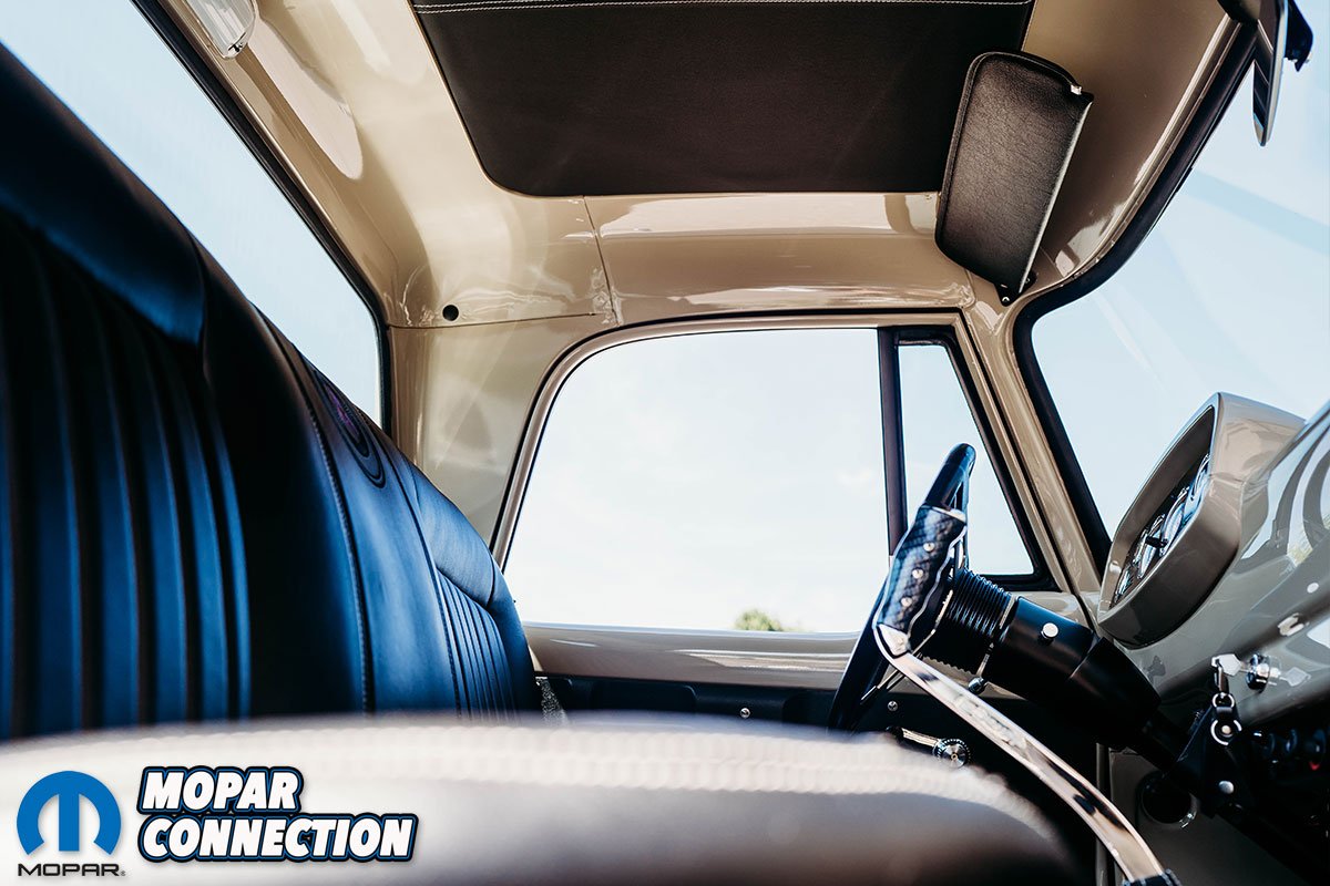 On the inside, the cab features a jaw-dropping black leather interior custom done by Chris Hillman from Mt. Juliet, TN. The interior houses Autometer gauges and a Mopar Tuff steering wheel. On the center of the seat is a beautifully stitched Fratzog logo.