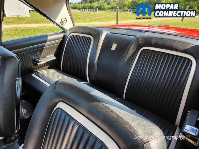 The interior was redone using Legendary seat covers, carpet, and interior door and quarter panels. The headliner was sourced from SMS Auto Fabrics. Diamond Trim in Aurora, Ontario, did the installation of the new seat covers and interior panels.