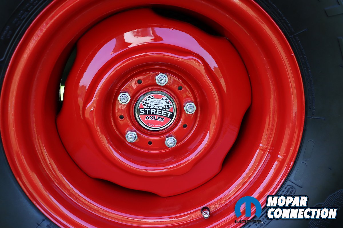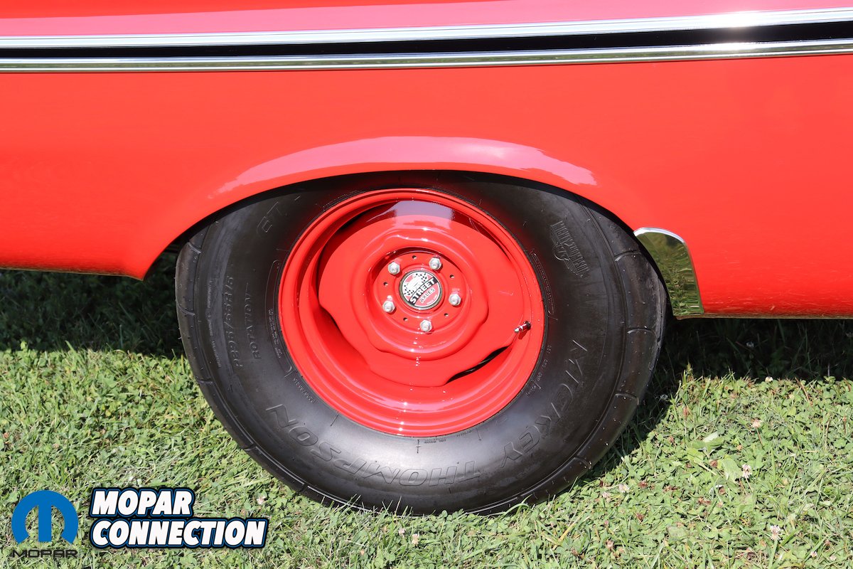 Jim has two sets of tires and rims to display with his car. For the classic factory appearance, he uses 14×5.5 wheels fitted with 7.50 whitewall tires and wheel covers, just as it sat at the dealership. For a more aggressive drag track look, he opts for American Racing Torque Thrust wheels with Uniroyal 205/75R15 tires in the front, paired with 15×8 painted steel rims and Mickey Thompson drag radials measuring 295/65R15 in the rear.