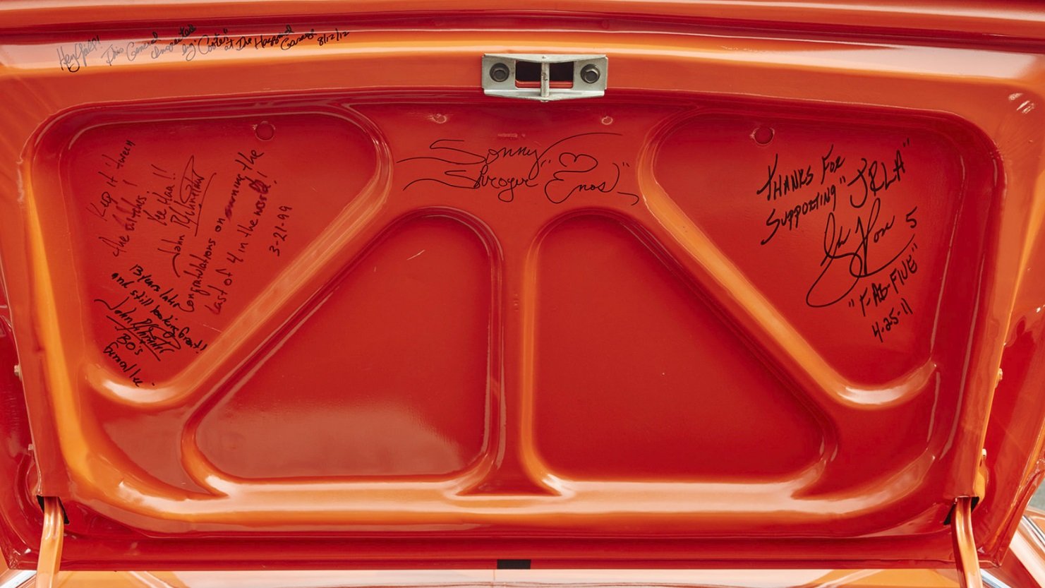 It’s been said at some point after John sold it quite a few years ago, it ended up in the hands of former NBA star Jalen Rose. He decided to strip the General of most of its iconic gear such as removing the flag on the roof, changing the 01 to 05 (his jersey number), changing the wheels out and changing the words “Bo’s General Lee” to instead read “Longboy”. Weird, we know. That being said, since then it has to put back to the exact condition it was in when John sold it. The underside of the trunk lid has been signed and inscribed by various cast members and celebrities including John, who has signed in two different areas over the years. Other signatures include those of Sonny Shroyer (Enos Strate), the late James Best (Rosco P. Coltrane), Rick Hurst (Cletus Hogg) and Jalen Rose.