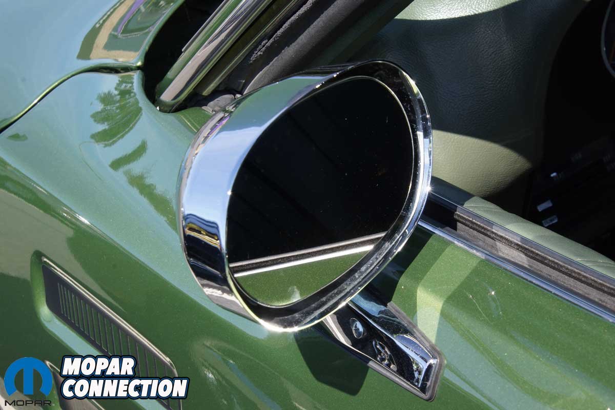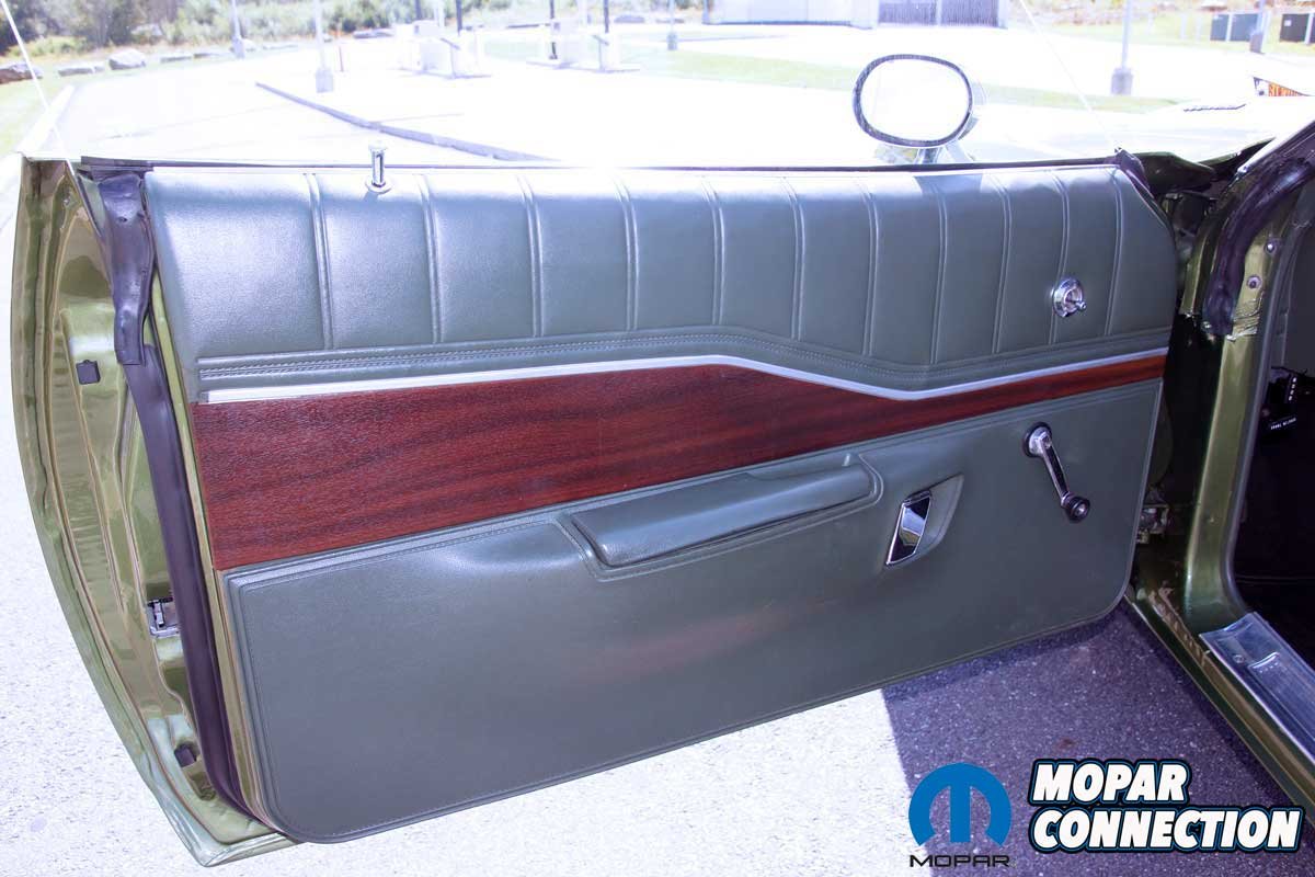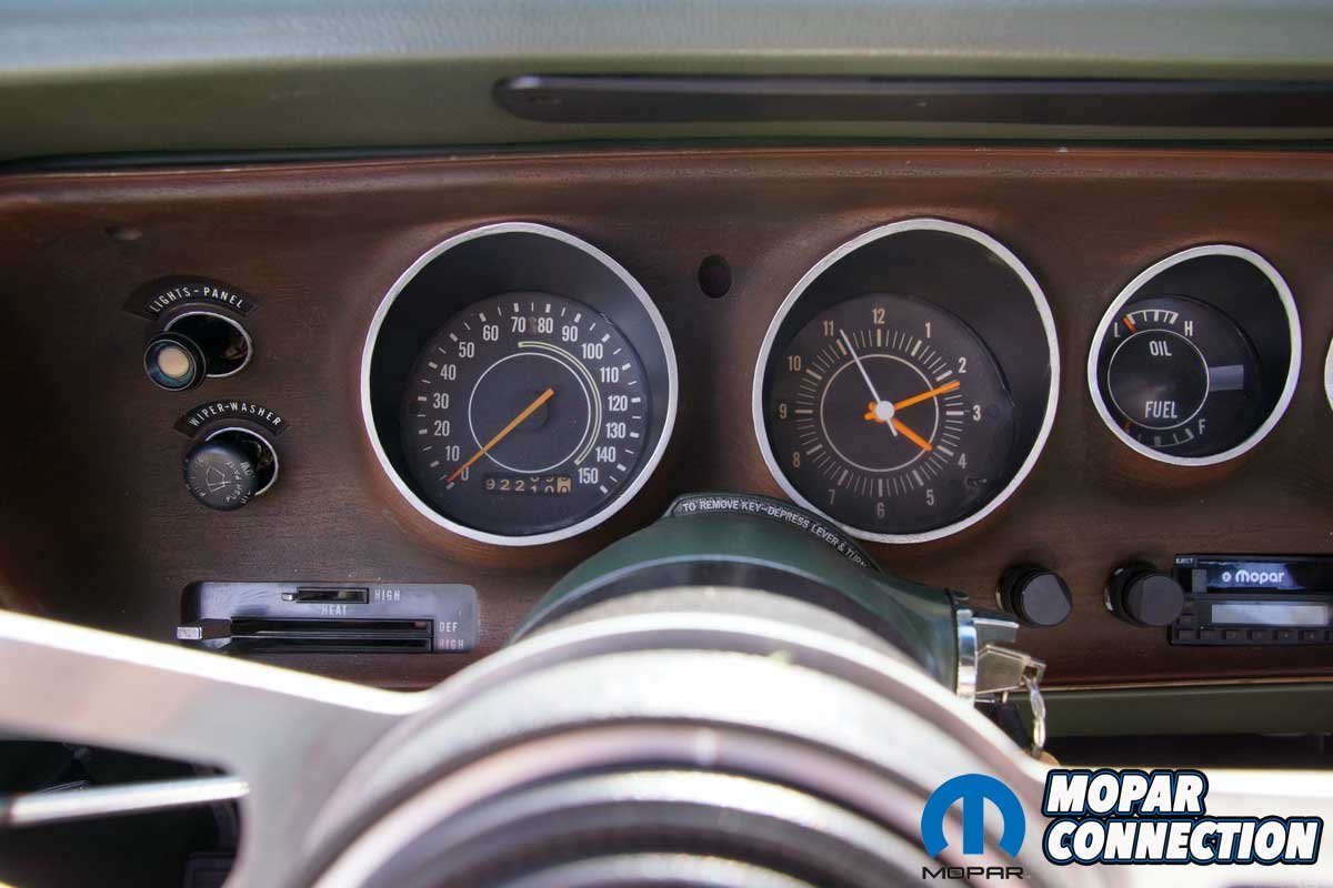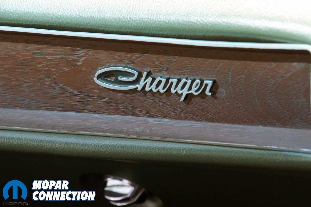 Before Parise’s ownership, the previous owner, a successful businessman, Serafine ‘Sar’ Tolerico (Sars Body Shop), repaired a few minor dings and repainted the rust-free Charger in its original Sherwood Green Metallic (GF7). The original green interior was faded but not damaged, so it was re-dyed to the factory color. For some reason, lost to time, the Charger was equipped with a front bench seat rather than buckets with a console.