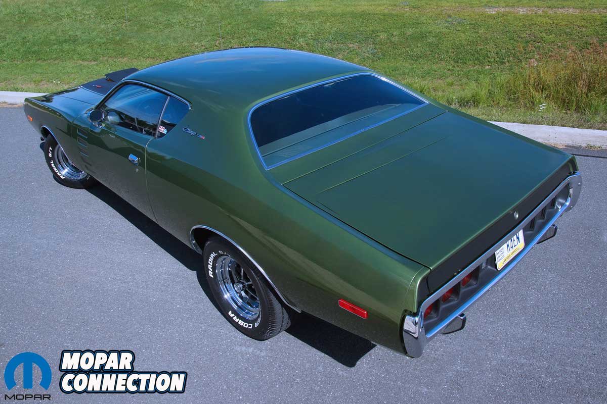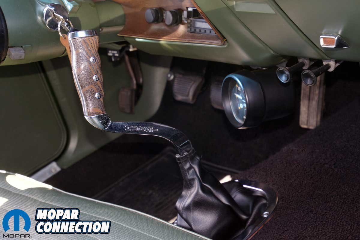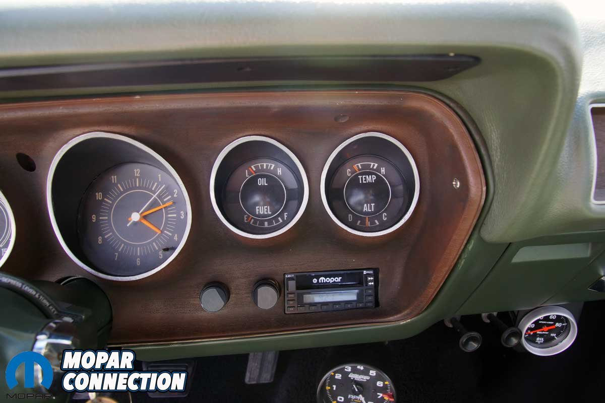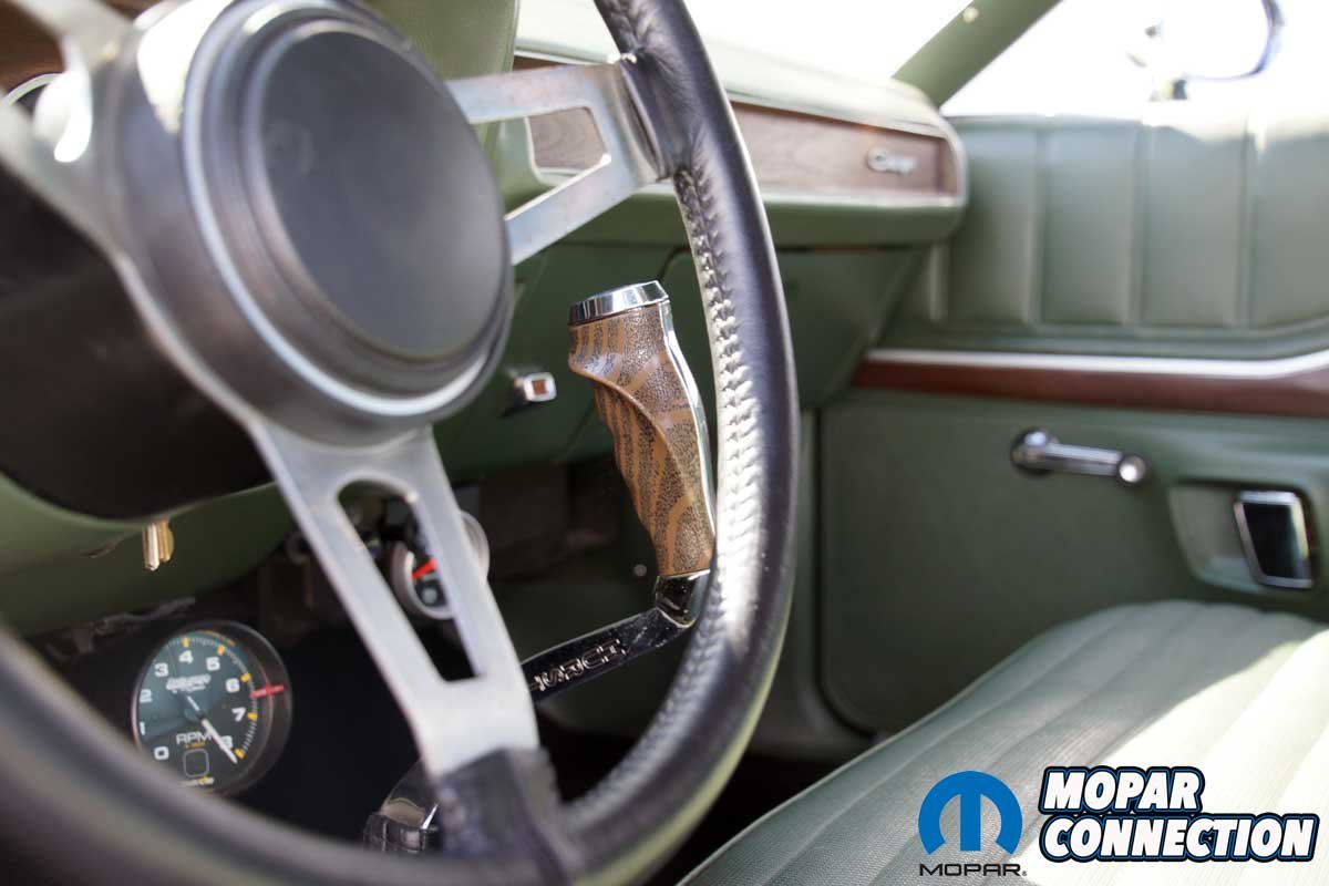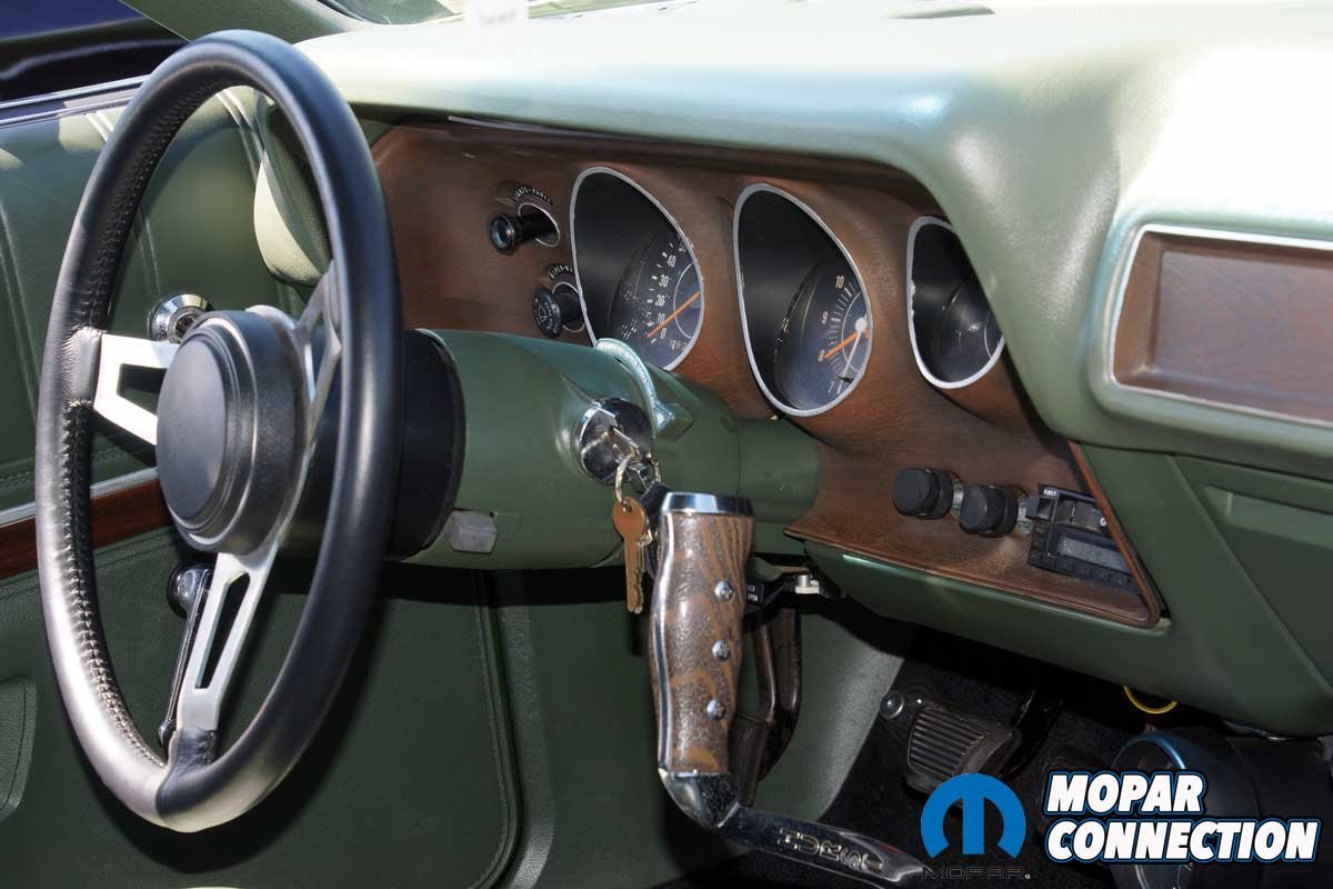 Before Parise’s ownership, the previous owner, a successful businessman, Serafine ‘Sar’ Tolerico (Sars Body Shop), repaired a few minor dings and repainted the rust-free Charger in its original Sherwood Green Metallic (GF7). The original green interior was faded but not damaged, so it was re-dyed to the factory color. For some reason, lost to time, the Charger was equipped with a front bench seat rather than buckets with a console.