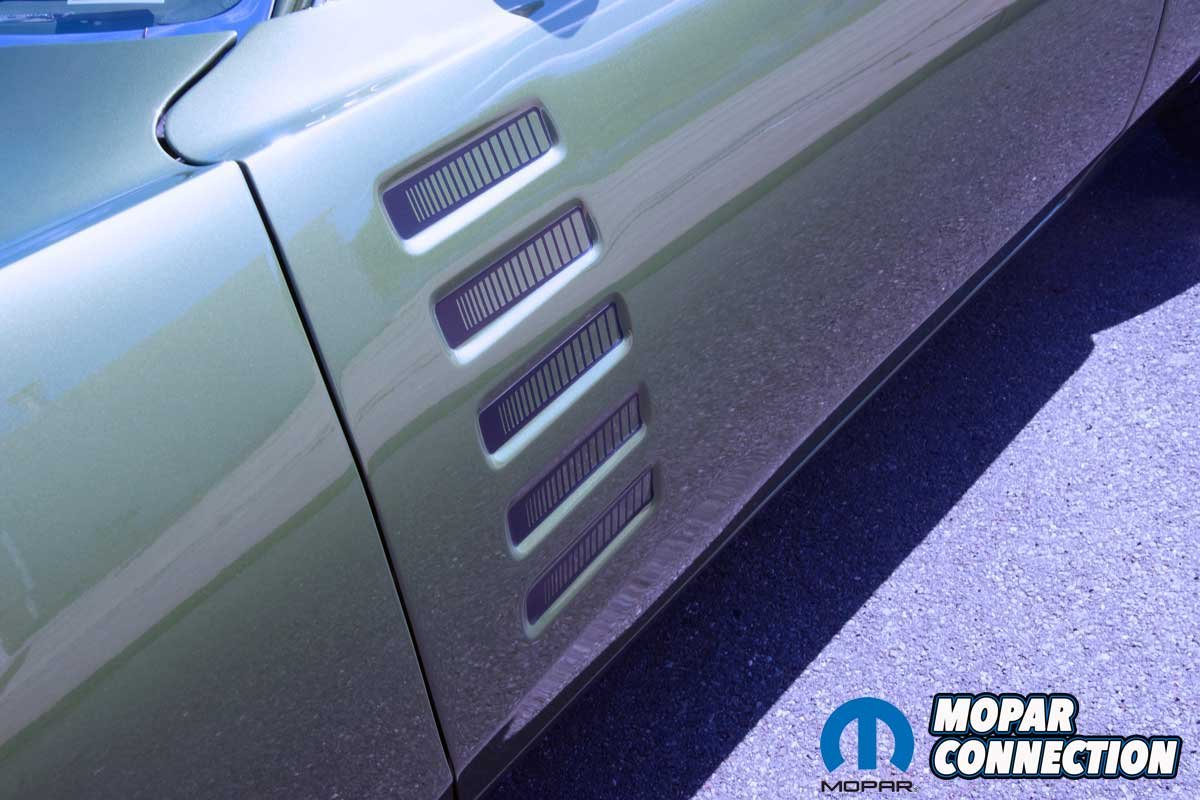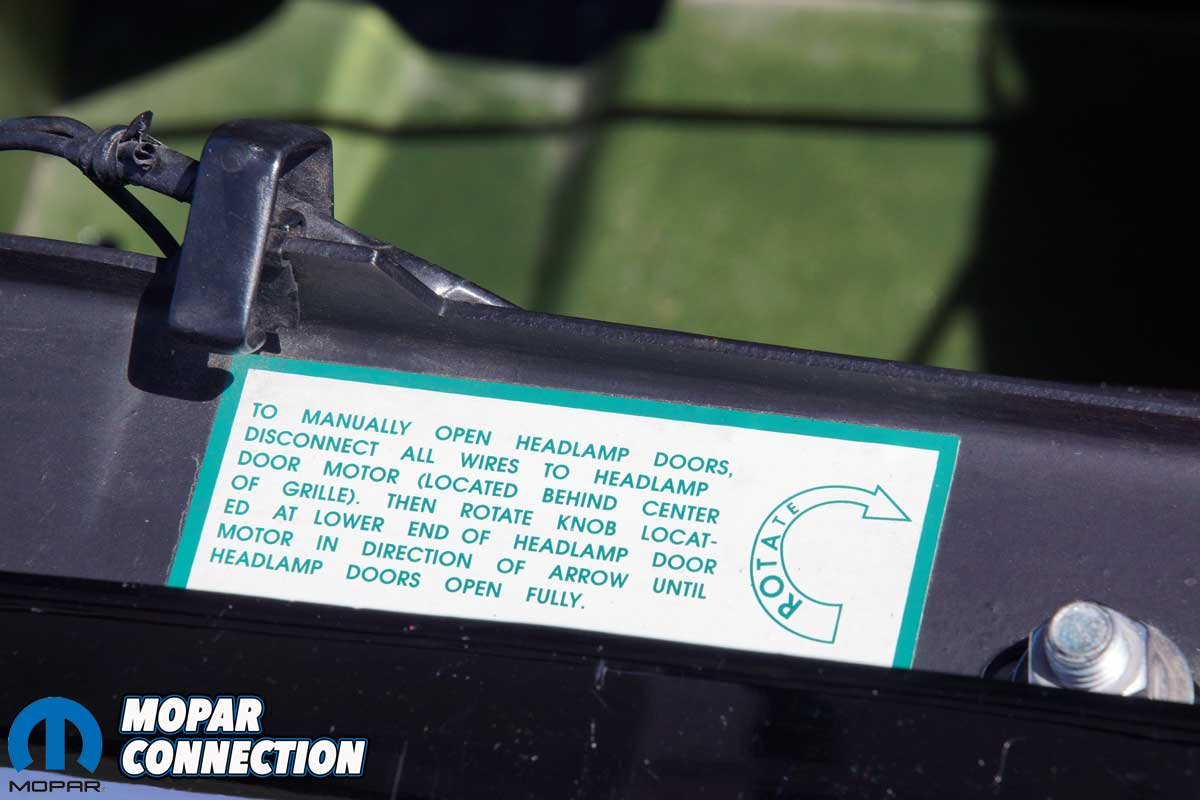The A57 order code required a unique recessed dark argent grille, louvered taillamps, a Power Bulge hood with a matte-black “Performance Treatment” finish, and the one-year-only, Rallye-specific simulated door louvers containing graphics. Concealed headlamps were optional and specified yet another distinctive grille design. Parise’s Charger Rallye has the optional concealed headlamps (L37).