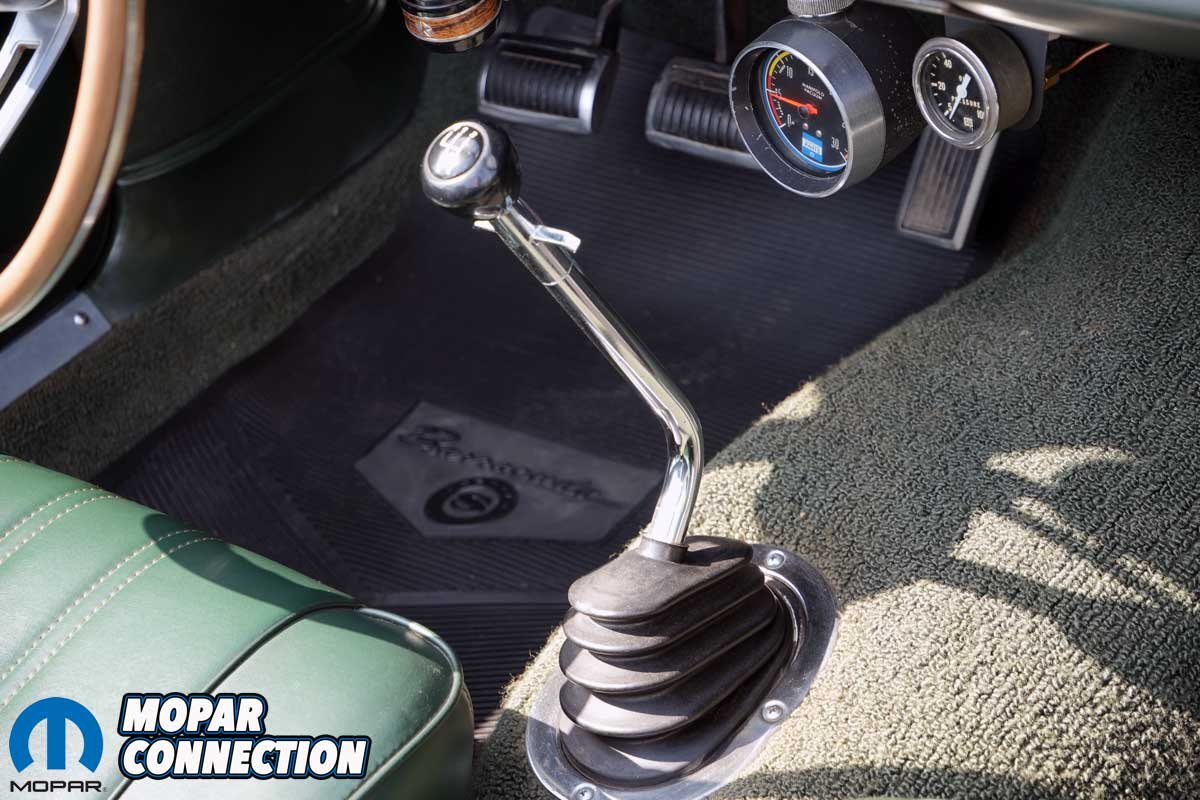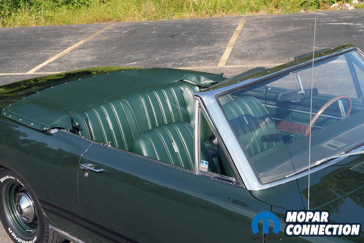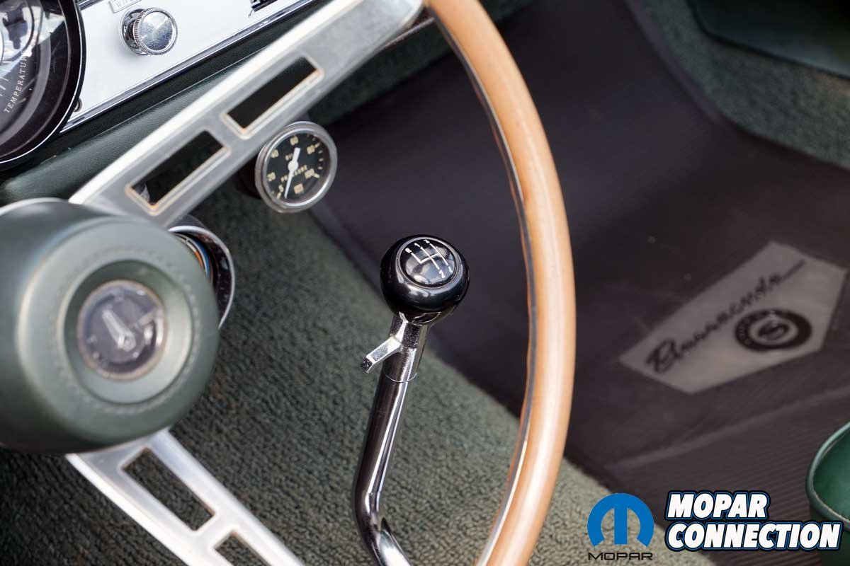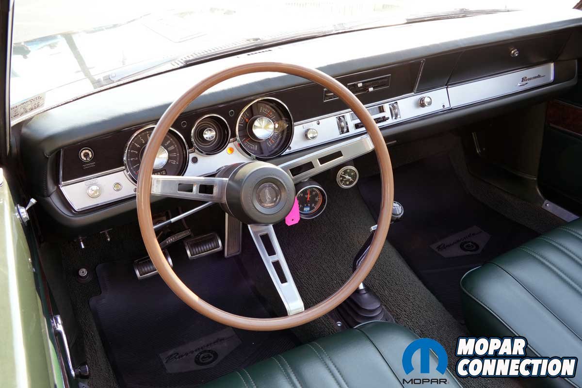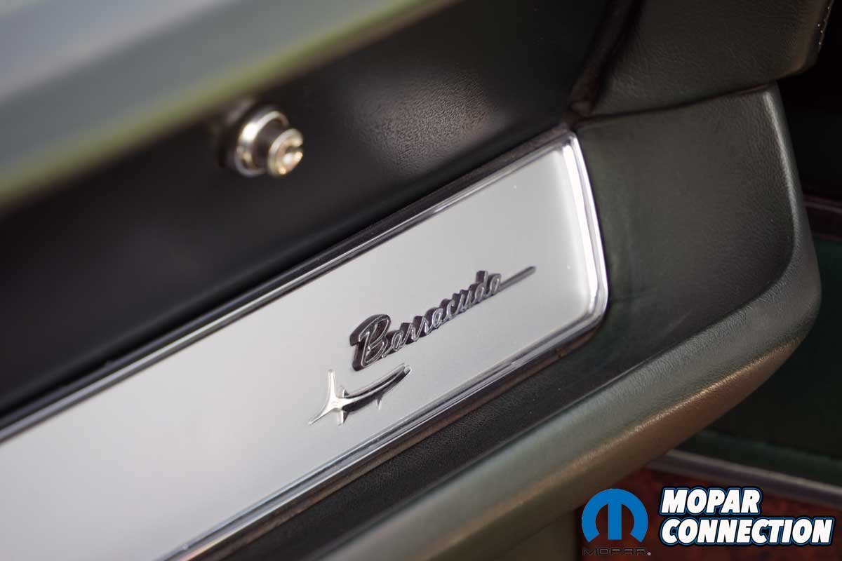 As with most convertible top vehicles, the interiors take a beating from the sun. Parise’s Barracuda was no exception. Prior to Sar’s purchase of the car, the seat upholstery and the carpet had been replaced with factory-appearing parts. Parise added the factory-style rubber Barracuda floor mats to protect the carpet.