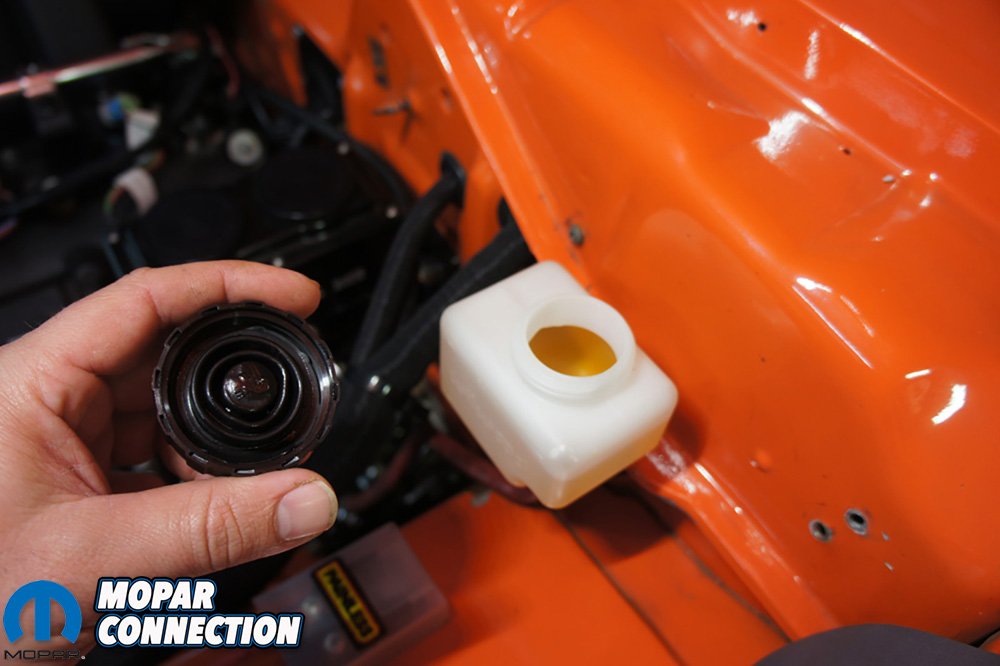 Above Left: We look over our American Powertrain Hydramax firewall mount and make sure it’s all tight and no leaks. Above Right: We check out reservoir and fluid is nice and clean and no need to replace.