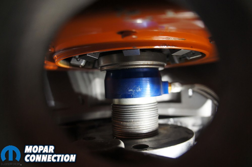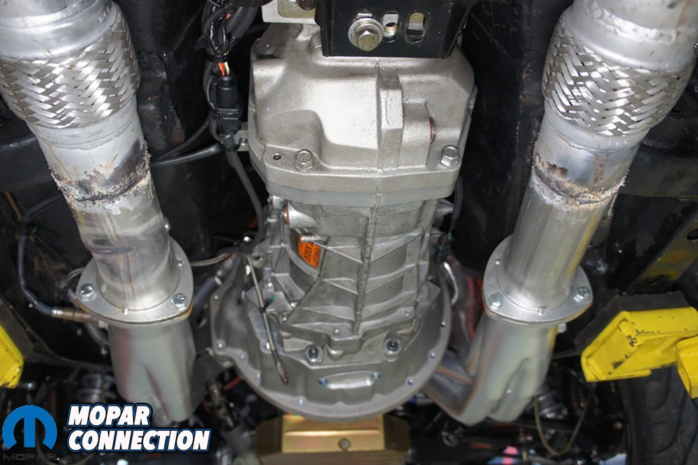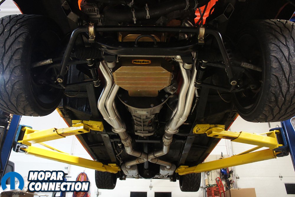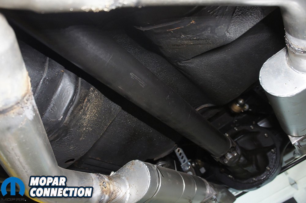 Above Right: Taking a peak of the undercarriage of Project Orange Crush. Above Right: We take closer look at our driveshaft and clearance of our exhaust.