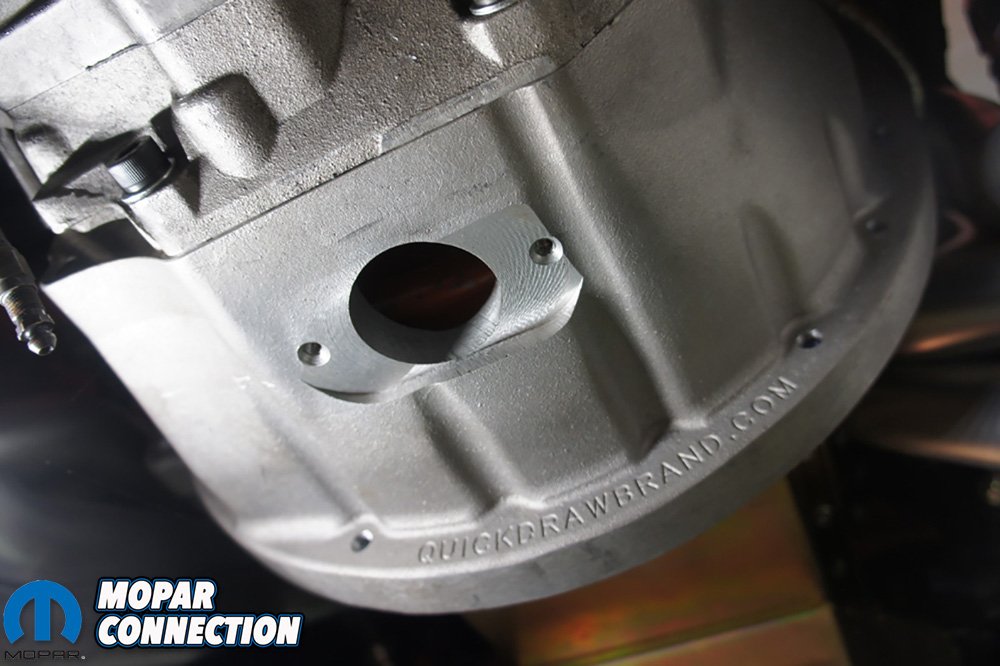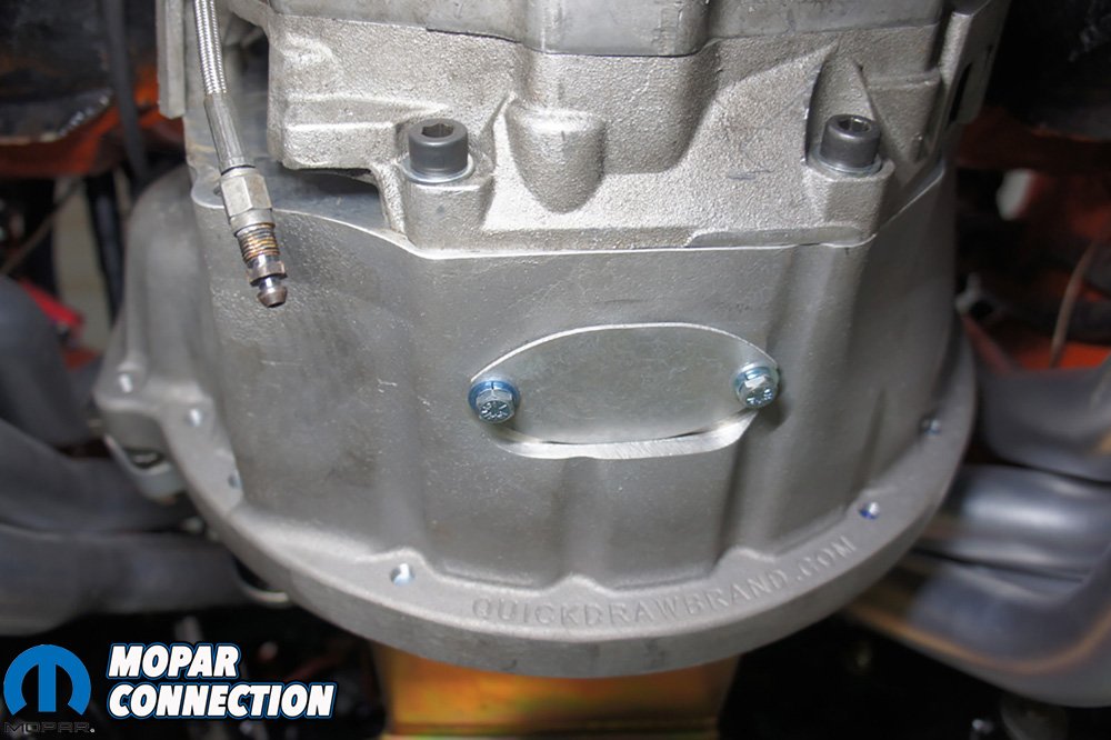Above Left: Small inspection hole on the Quick Draw Brand bell-housing from American Powertrain. Above Right: A couple 7/16 bolts hold on the cover plate.