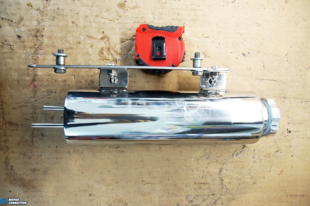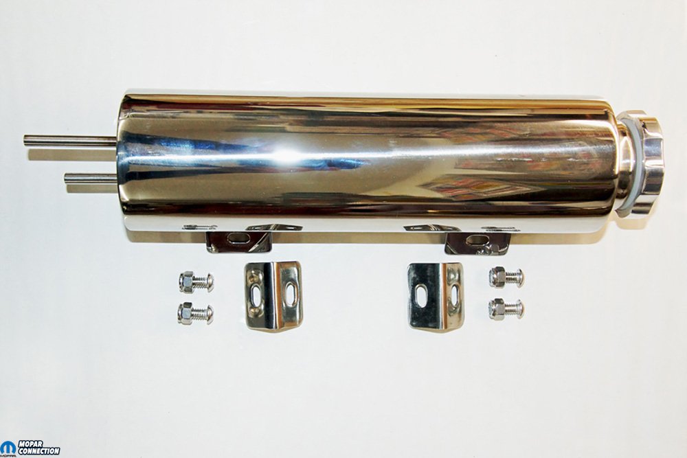 Mancini Racing offers many polished stainless-steel overflow tank configurations; we selected a 3-inch diameter, 10-inch overall length tank that would fit between the radiator and the passenger side fender apron (in a similar location as the factory units from the 1970s). The overflow tank included a twist-on cap and mounting hardware. Extending from the bottom of the recovery tank are two tubes. One is the inlet to the recovery tank from the radiator, and the other tube extends approximately 2/3rds into the tank. This tube is an overflow, which allows fluid to exit should the recovery tank become overfilled.