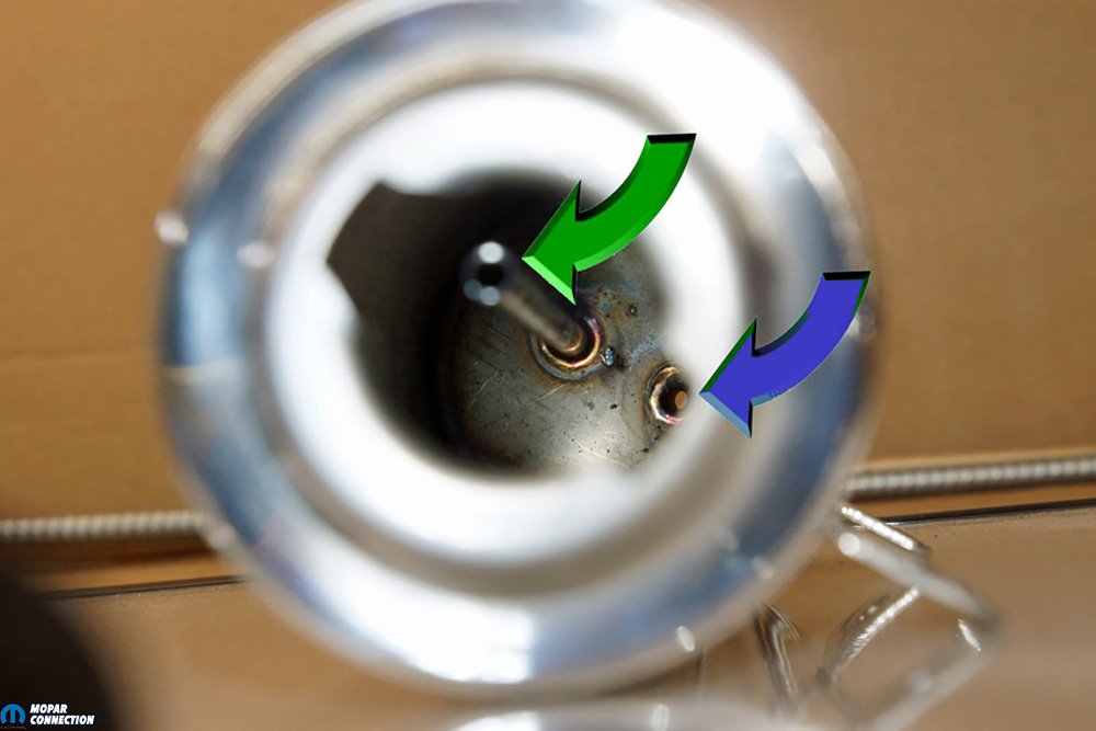 Above Left: To achieve better containment of our 1967 Dart’s coolant in the cooling system, we contacted Mancini Racing about an OER® stainless steel overflow recovery tank (part no. OER60761). Included with the overflow container was installation hardware, which comprised the fasteners and mounting tabs and a screw-on cap. Above Right: Viewing the inside of the overflow tank allowed us to see the orientation of the two tubes that extended from the bottom of the tank. One tube is attached flush to the bottom of the recovery tank (blue arrow). The flush mounted tube is the inlet into the recovery tank from the radiator. If the coolant level ever rose to the top of the second tube (green arrow), coolant would exit the tank via the overflow tube.
