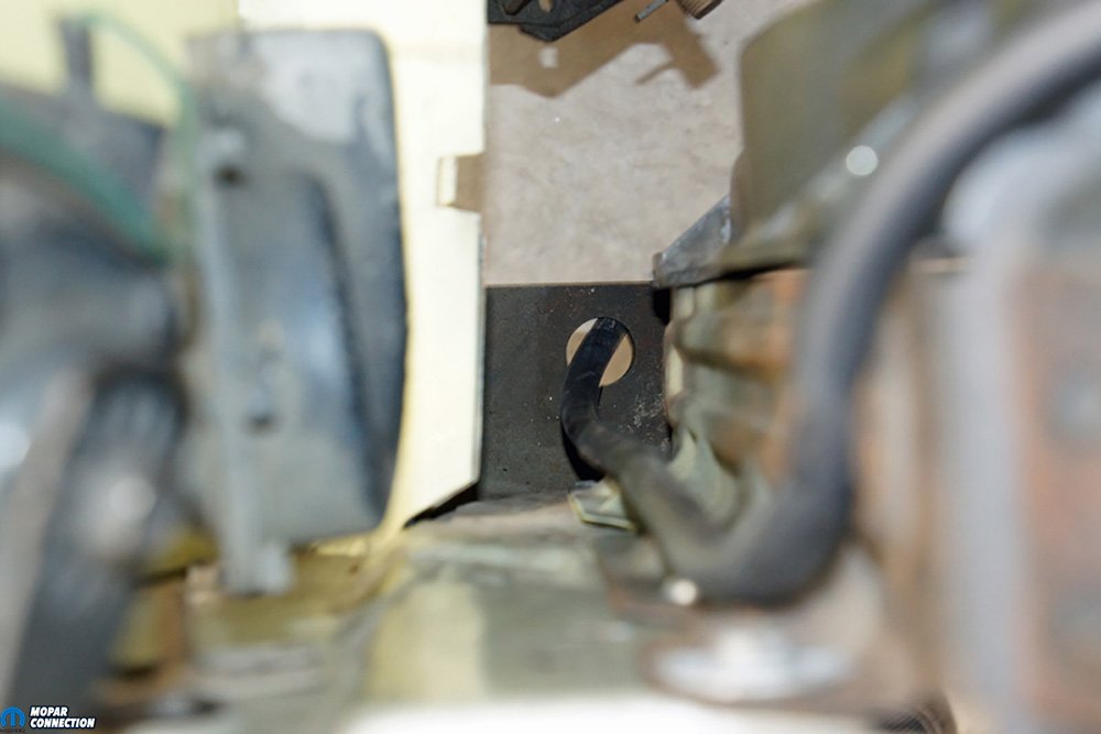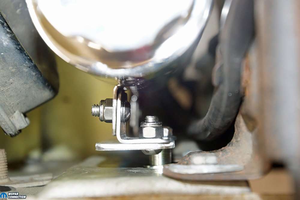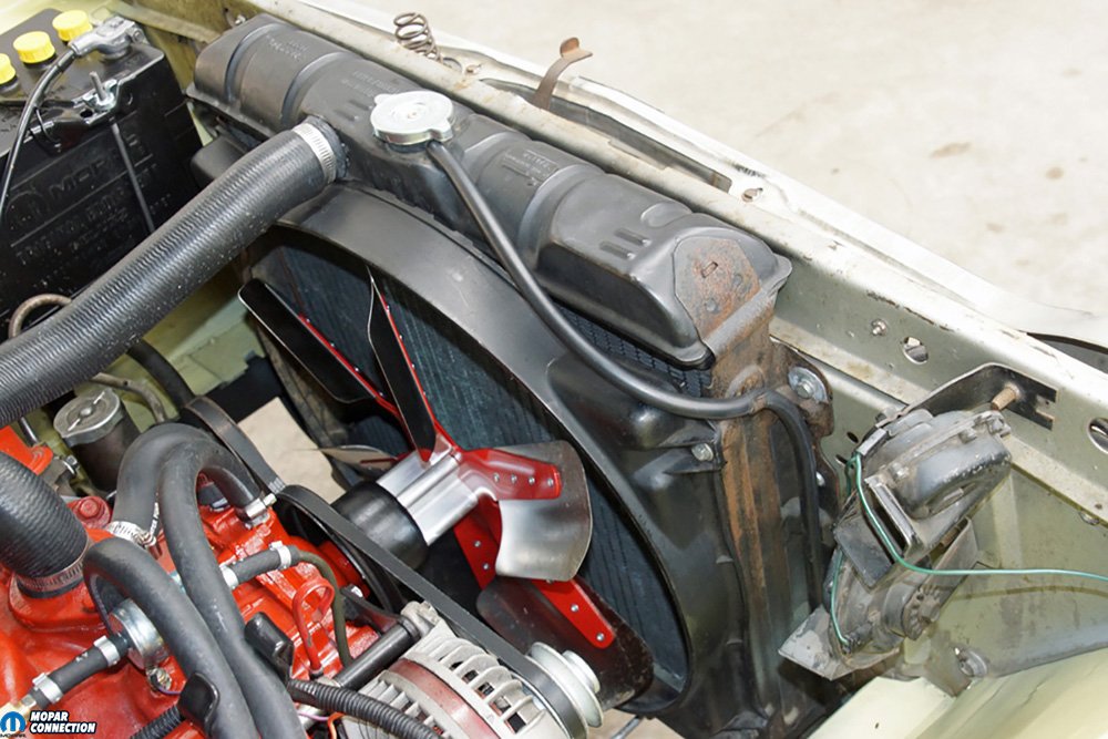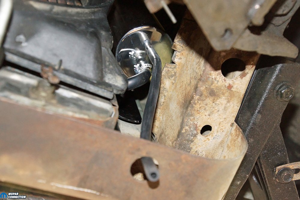 Above: With the installation of the OER overflow recovery tank, we have improved our system to a more environmentally friendly closed system. We placed the overflow tank in the factory location of the ‘70s A-bodies. The horns on the ‘70s rides were moved under the battery tray, but due to ours not being relocated, we had to modify one of the horn brackets (bend it slightly), so the tank would fit.