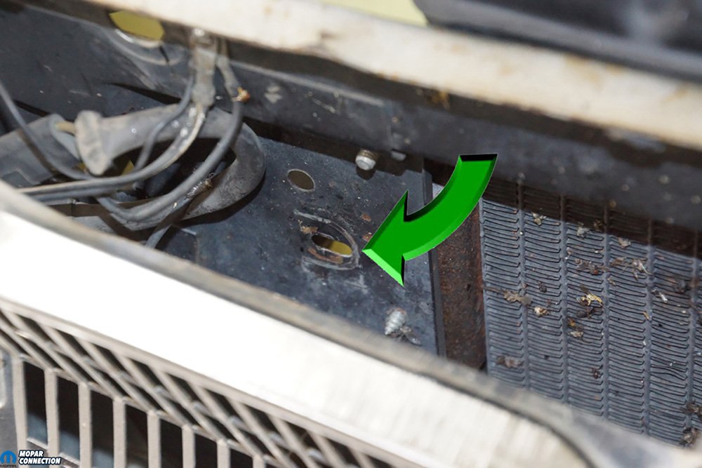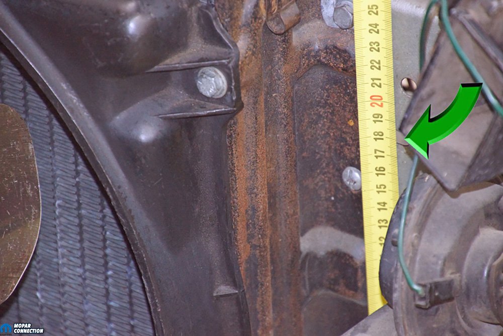 Above Left: At one time our Dart had air conditioning (AC). While all the AC components had been removed before we purchased the Dart, there remained two slotted condenser mounting holes in the radiator support (green arrow – only one shown). The slots would allow for fine-tuning of the position of the overflow tank while not requiring us to drill any holes into the vehicle. Above Right: To determine the length of a mounting bracket that needed to be fabricated, we measured the distance between the slotted holes (green arrow – only top hole shown) in the radiator support.