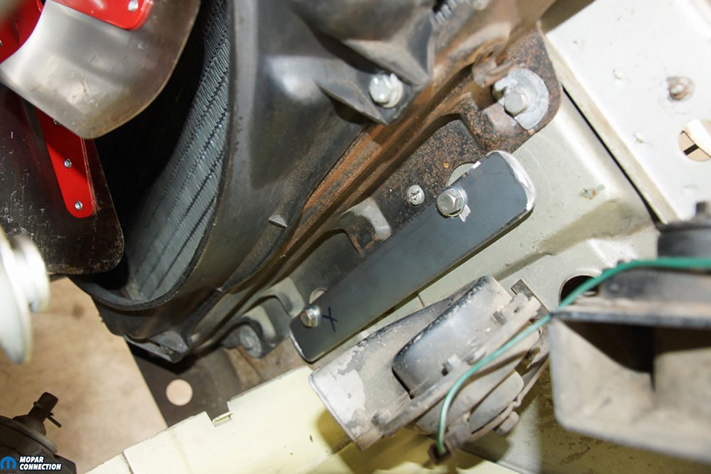 To mount the overflow recovery tank, we located a perfect location between the radiator and the horns. The Dart was an air conditioning car at one time, so there were slots in the radiator support for the condenser mounting brackets. These slots provided an excellent place for a bracket for the recovery tank. To put the plan in motion, in addition to the installation kit that came with the recovery tank, we needed a 1/8 x 1 x 12-inch flat steel strip, two ¼-inch spacers, and the hardware to secure the new bracket.