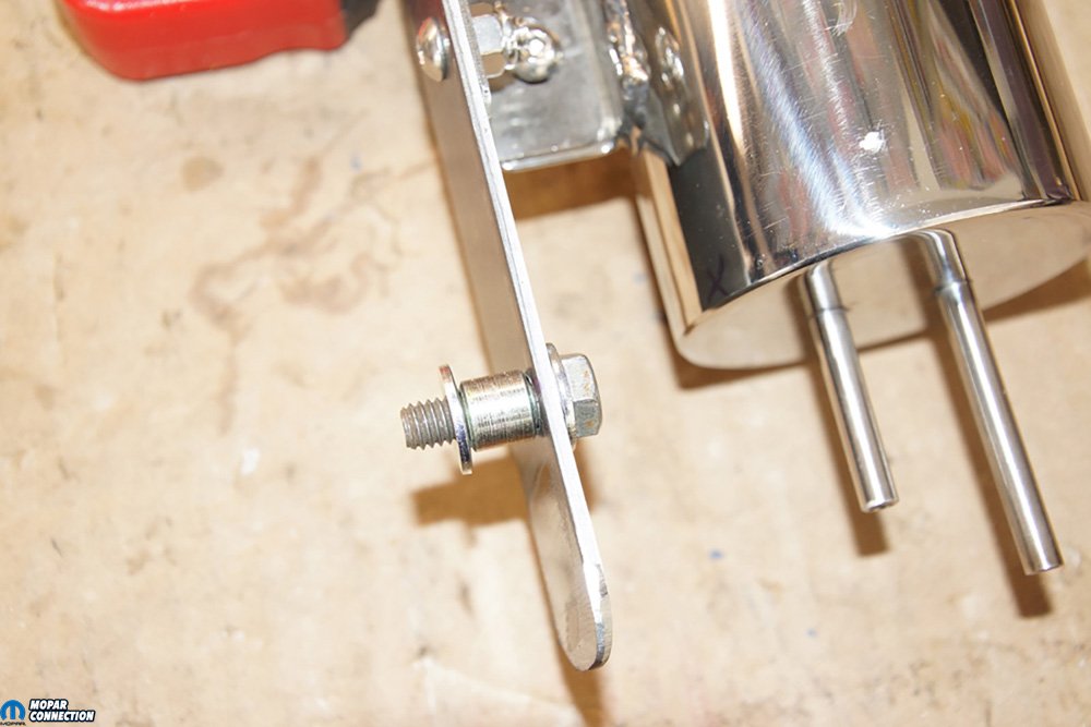 Above Left: This closeup shows how we set up the spacers and washers. Each tube from the overflow tank can be easily seen. The left tube is from the radiator to the tank, and the right tube allows coolant to exit from the overflow tank if the fluid level ever exceeded the top of the internal tube. Above Right: The assembly was test fitted for the last time. The factory overflow tube was run in its stock location next to the radiator. Satisfied with the location and fit, we disassembled the mounting bracket so we could paint all the fabricated parts. We shot everything in a satin black.