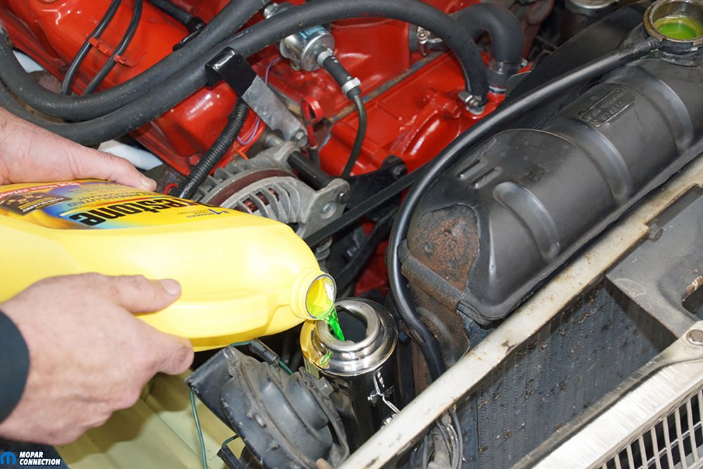 Above Left: We ran a smaller 1/8-inch hose from the overflow tank to the factory location at the bottom of the radiator support. This hose will only be used if the cooling system happens to be overfilled (or the engine overheats). Above Right: We topped off the radiator and then filled the overflow tank to approximately 33% full (we ended up readjusting the fill to 20%). By only filling a portion of the tank, there would be room for the coolant to exit the radiator without overfilling the overflow tank.