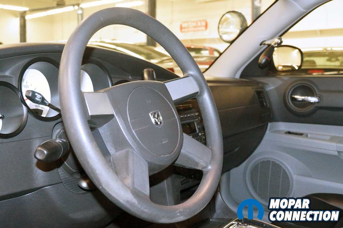 Swapping the factory steering wheel with one from a Chrysler 300 was surprisingly straightforward. The 300 steering wheel, with its upscale look, was a perfect match for the fresh interior. The steering wheel’s one-third simulated wood grain and two-thirds leather wrap added a touch of luxury to the updated interior.