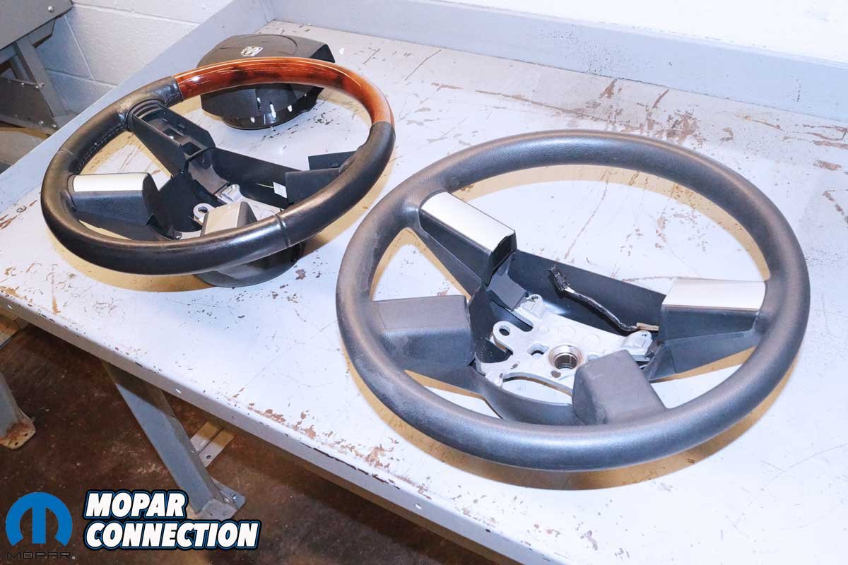 The Chrysler 300 steering wheel was equipped with touch control buttons, while the factory steering wheel was not. I removed the touch control button inserts and related wiring from the Chrysler 300 steering wheel and installed the blank inserts from the factory steering wheel into the 300 wheel.